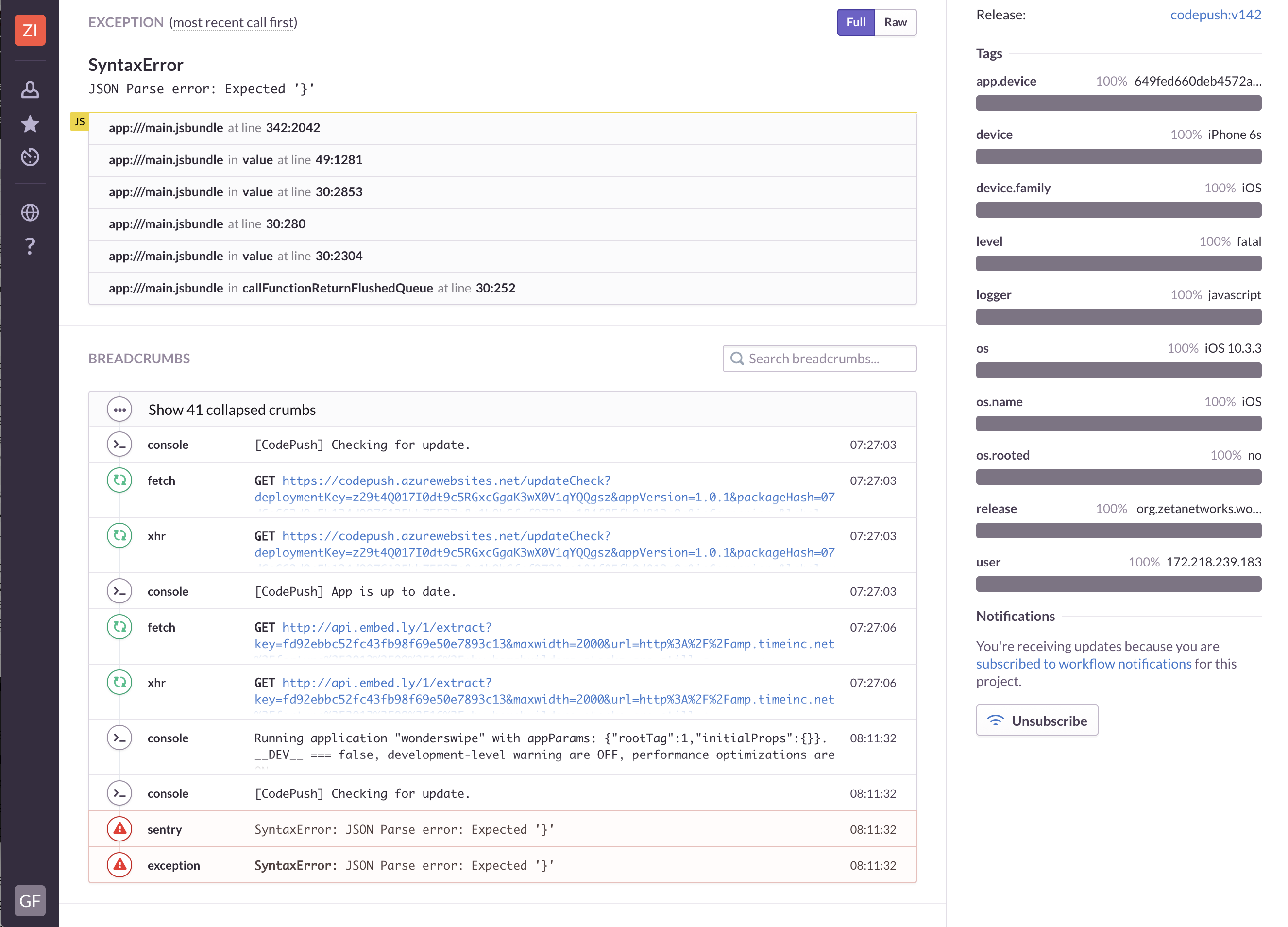 {"id":"19fc109f20f542b4a03cbb905d9d105f","project":198937,"release":"org.[ORG].[APP_NAME]-codepush:v142","dist":null,"platform":"cocoa","culprit":"?(app:///main.jsbundle)","message":"SyntaxError JSON Parse error: Expected '}' ?(app:///main.jsbundle)","datetime":"2017-09-06T08:11:32.000000Z","time_spent":null,"tags":[["logger","javascript"],["sentry:user","ip:172.218.239.183"],["sentry:release","org.[ORG].[APP_NAME]-codepush:v142"],["level","fatal"],["device","iPhone8,1"],["device.family","iOS"],["app.device","649fed660deb4572a8531db5d64626e88459ec47"],["os","iOS 10.3.3"],["os.name","iOS"],["os.rooted","no"]],"contexts":{"device":{"model_id":"N71AP","family":"iOS","arch":"arm64","storage_size":127989493760,"free_memory":39403520,"memory_size":2102919168,"boot_time":"2017-08-30T09:16:03Z","timezone":"PDT","model":"iPhone8,1","usable_memory":1597571072,"type":"device"},"app":{"app_identifier":"org.[ORG].[APP_NAME]","app_name":"[APP_NAME]","device_app_hash":"649fed660deb4572a8531db5d64626e88459ec47","app_id":"C6DF1651-74F7-333A-B8DF-A27F602509F1","build_type":"test","app_start_time":"2017-09-06T08:11:32Z","app_version":"1.0.1","type":"app","app_build":"1"},"os":{"rooted":false,"kernel_version":"Darwin Kernel Version 16.7.0: Thu Jun 15 18:33:36 PDT 2017; root:xnu-3789.70.16~4/RELEASE_ARM64_S8000","version":"10.3.3","build":"14G60","type":"os","name":"iOS"}},"errors":[{"url":"app:///main.jsbundle","type":"js_no_source"},{"url":"app:///main.jsbundle","type":"js_no_source"},{"url":"app:///main.jsbundle","type":"js_no_source"},{"url":"app:///main.jsbundle","type":"js_no_source"},{"url":"app:///main.jsbundle","type":"js_no_source"},{"url":"app:///main.jsbundle","type":"js_no_source"},{"url":"app:///main.jsbundle","type":"js_no_source"},{"url":"app:///main.jsbundle","type":"js_no_source"},{"url":"app:///main.jsbundle","type":"js_no_source"},{"url":"app:///main.jsbundle","type":"js_no_source"},{"url":"app:///main.jsbundle","type":"js_no_source"},{"url":"app:///main.jsbundle","type":"js_no_source"},{"url":"app:///main.jsbundle","type":"js_no_source"},{"url":"app:///main.jsbundle","type":"js_no_source"},{"url":"app:///main.jsbundle","type":"js_no_source"},{"url":"app:///main.jsbundle","type":"js_no_source"},{"url":"app:///main.jsbundle","type":"js_no_source"},{"url":"app:///main.jsbundle","type":"js_no_source"},{"url":"app:///main.jsbundle","type":"js_no_source"},{"url":"app:///main.jsbundle","type":"js_no_source"},{"url":"app:///main.jsbundle","type":"js_no_source"},{"url":"app:///main.jsbundle","type":"js_no_source"},{"url":"app:///main.jsbundle","type":"js_no_source"},{"url":"app:///main.jsbundle","type":"js_no_source"},{"url":"app:///main.jsbundle","type":"js_no_source"},{"url":"app:///main.jsbundle","type":"js_no_source"},{"url":"app:///main.jsbundle","type":"js_no_source"},{"url":"app:///main.jsbundle","type":"js_no_source"},{"url":"app:///main.jsbundle","type":"js_no_source"},{"url":"app:///main.jsbundle","type":"js_no_source"},{"url":"app:///main.jsbundle","type":"js_no_source"},{"url":"app:///main.jsbundle","type":"js_no_source"},{"url":"app:///main.jsbundle","type":"js_no_source"},{"url":"app:///main.jsbundle","type":"js_no_source"},{"url":"app:///main.jsbundle","type":"js_no_source"},{"url":"app:///main.jsbundle","type":"js_no_source"}],"extra":{"session:duration":588},"fingerprint":["{{ default }}"],"metadata":{"type":"SyntaxError","value":"JSON Parse error: Expected '}'"},"received":1504685498.0,"sdk":{"client_ip":"172.218.239.183","version":"0.23.0","name":"sentry-react-native","integrations":["sentry-cocoa"]},"sentry.interfaces.Breadcrumbs":{"values":[{"category":"console","timestamp":1504671134.0,"message":"[CodePush] Checking for update.","type":"default","level":"fatal"},{"category":"fetch","timestamp":1504671134.0,"level":"fatal","type":"http","data":{"url":"https://codepush.azurewebsites.net/updateCheck?deploymentKey=z29t4Q017I0dt9c5RGxcGgaK3wX0V1qYQQgsz&appVersion=1.0.1&packageHash=07d6e663d0c5b134d9976135bb75537e8a1b9b6faf9728ae184f85fb0d813a9a&isCompanion=&label=v142&clientUniqueId=B61EA9FF-1C34-41BA-A309-03DE567A52B8","status_code":"null","method":"GET"}},{"category":"xhr","timestamp":1504671134.0,"level":"fatal","type":"http","data":{"url":"https://codepush.azurewebsites.net/updateCheck?deploymentKey=z29t4Q017I0dt9c5RGxcGgaK3wX0V1qYQQgsz&appVersion=1.0.1&packageHash=07d6e663d0c5b134d9976135bb75537e8a1b9b6faf9728ae184f85fb0d813a9a&isCompanion=&label=v142&clientUniqueId=B61EA9FF-1C34-41BA-A309-03DE567A52B8","status_code":"200","method":"GET"}},{"category":"console","timestamp":1504671135.0,"message":"[CodePush] App is up to date.","type":"default","level":"fatal"},{"category":"console","timestamp":1504677445.0,"message":"Running application \"[APP_NAME]\" with appParams: {\"rootTag\":1,\"initialProps\":{}}. __DEV__ === false, development-level warning are OFF, performance optimizations are ON","type":"default","level":"fatal"},{"category":"console","timestamp":1504677445.0,"message":"[CodePush] Checking for update.","type":"default","level":"fatal"},{"category":"fetch","timestamp":1504677446.0,"level":"fatal","type":"http","data":{"url":"https://codepush.azurewebsites.net/updateCheck?deploymentKey=z29t4Q017I0dt9c5RGxcGgaK3wX0V1qYQQgsz&appVersion=1.0.1&packageHash=07d6e663d0c5b134d9976135bb75537e8a1b9b6faf9728ae184f85fb0d813a9a&isCompanion=&label=v142&clientUniqueId=B61EA9FF-1C34-41BA-A309-03DE567A52B8","status_code":"null","method":"GET"}},{"category":"xhr","timestamp":1504677446.0,"level":"fatal","type":"http","data":{"url":"https://codepush.azurewebsites.net/updateCheck?deploymentKey=z29t4Q017I0dt9c5RGxcGgaK3wX0V1qYQQgsz&appVersion=1.0.1&packageHash=07d6e663d0c5b134d9976135bb75537e8a1b9b6faf9728ae184f85fb0d813a9a&isCompanion=&label=v142&clientUniqueId=B61EA9FF-1C34-41BA-A309-03DE567A52B8","status_code":"200","method":"GET"}},{"category":"console","timestamp":1504677446.0,"message":"[CodePush] App is up to date.","type":"default","level":"fatal"},{"category":"fetch","timestamp"