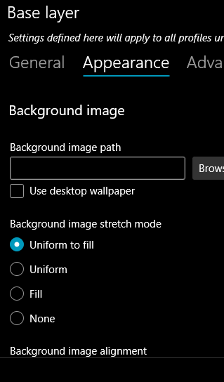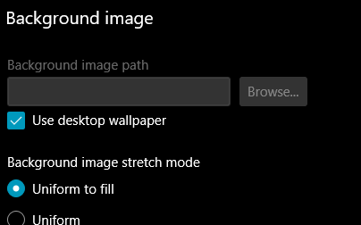 ## Summary of the Pull Request Two parts: * Hide the BG image settings when no image is specified * Add a checkbox for "Use desktop wallpaper". When that's checked, the BG image path input is hidden. Unchecking that box restores the path to what it was before. ## PR Checklist * [x] Closes microsoft#8763 * [x] I work here ## Validation Steps Performed Tested manually