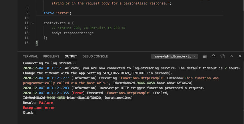 When streaming logs in VS Code, if my function throws and exception, the stack trace is not displayed in the logs, making it difficult to debug the issue: