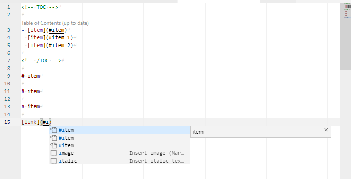 See screenshot. Each "item" should have a unique anchor value: "item", "item-1", "item-2" etc. Intellisense just shows the "item" multiple times. The table of contents was generated with an extension just to show how the links should be; it's not relevant to the issue.