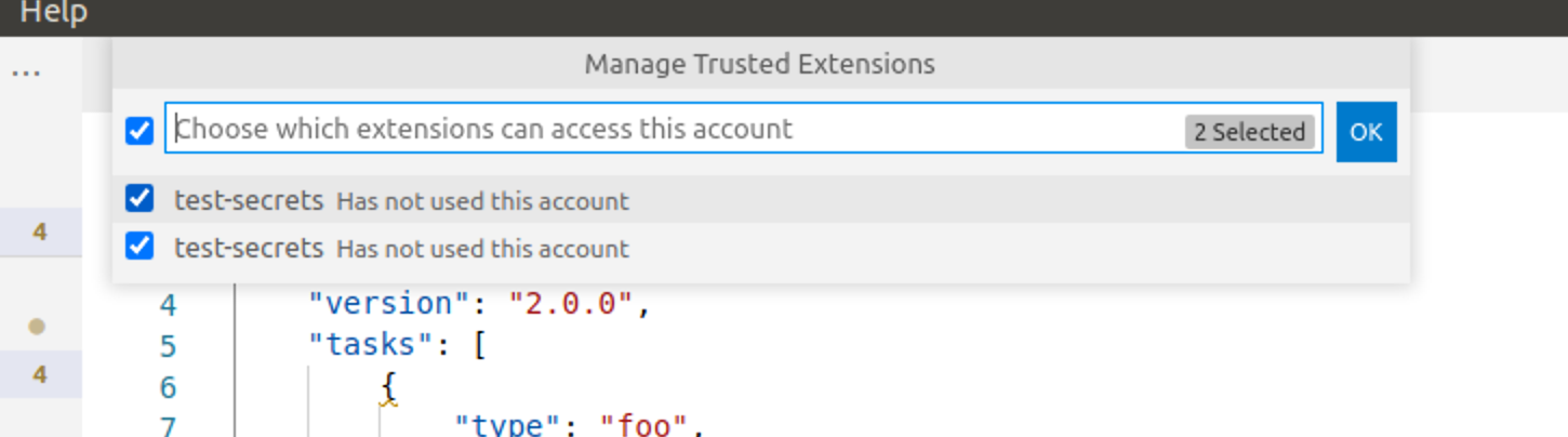 Checkout the confusing screen capture below. For testing #117290 I have renamed my extension from test-secrets to test-secrets2 (only id, not display name and hence the funny screen shot). The problem is that the auth logic still knows about the test-secrets extension although it doesn't exist anymore. I would assume the same happens in the real world when uninstalling an extension and IMO the auth-data should then be dropped