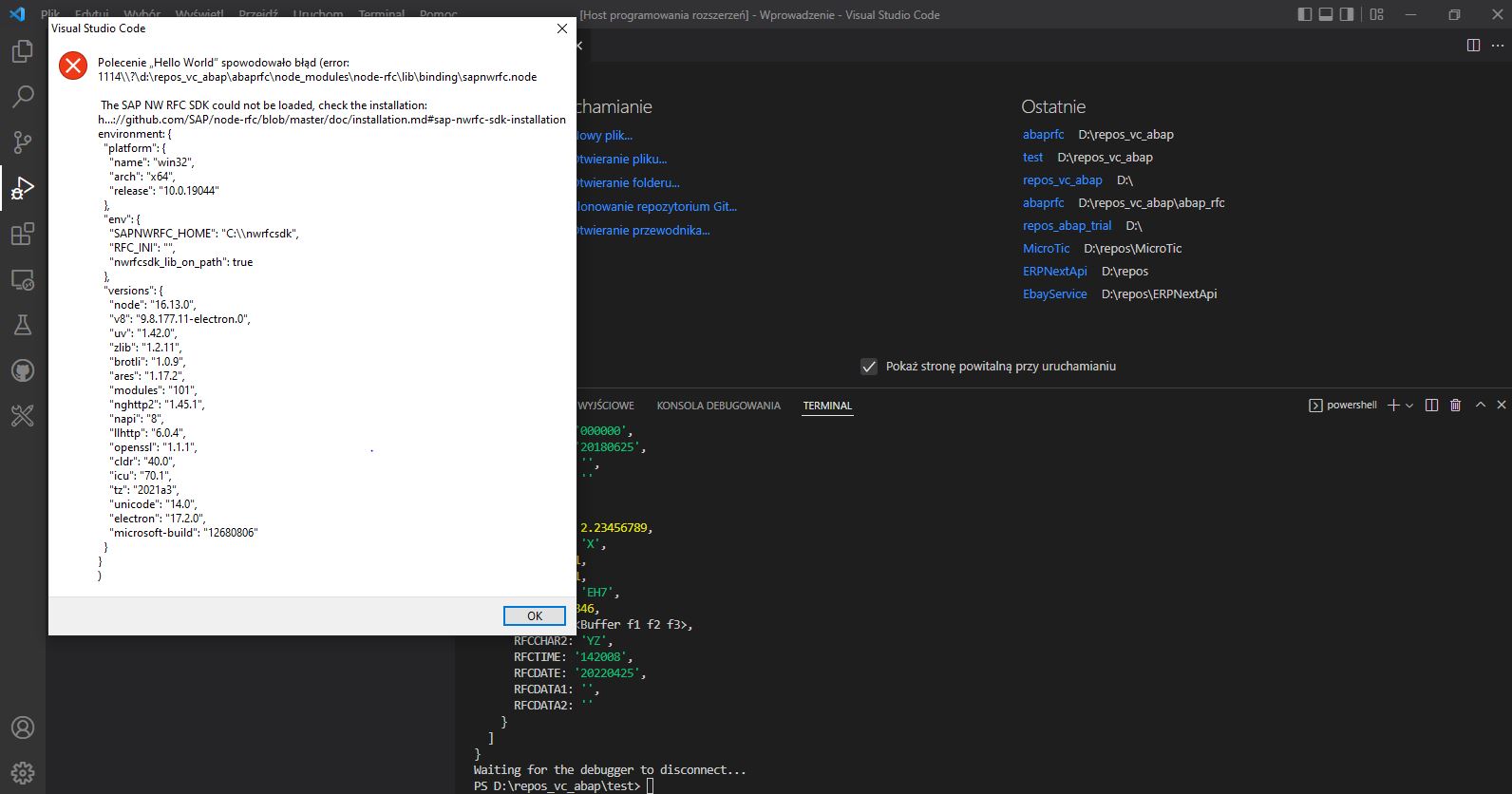 Hi, i have a specific problem with running the library node-rfc. When I run a simple script with node-rfc everything works fine, but when I want to use the library in vs code extesion i have error "The SAP NW RFC SDK could not be loaded, check the installation "
