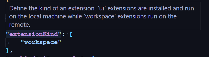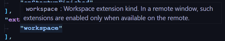 In a package.json file, JSON hovers will correctly use the description of the property or the value for enum types. For example, notice the difference when hovering over extensionKind versus hovering over workspace: