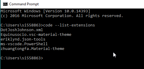 c:\vscode.cd c:\vscodecode --list-extensionsfrom that command line consolecode --list-extensionsdoesn't work for VSCode installed by unzipping from a VSCode zip package.I would expect it still work same as for a VSCode installed from a VSCode installer as shown below
