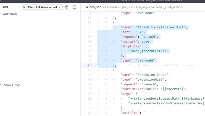 Have this config ``` "name": "Attach to Extension Host", "port": 5870, "request": "attach", "restart": true, "skipFiles": [ "<node_internals>/**" ], "type": "pwa-node" }, ``` * start and notice how for a split second the disconnect button shows, after that it becomes stop * the same is for stop (which behaves like disconnect)