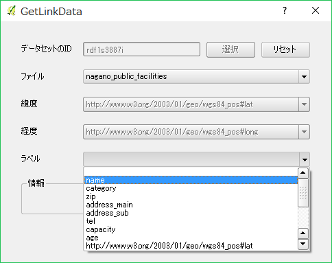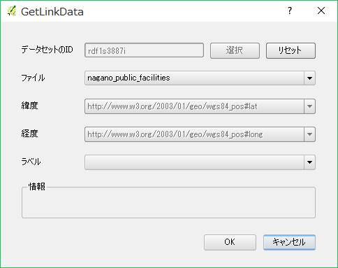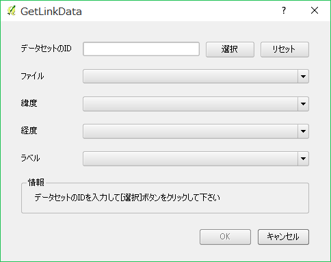 QGISの「Web」メニューに追加された「GetLinkData」→「LinkData.orgからデータを取得する」を選択すると、ダイアログボックスが表示されます。