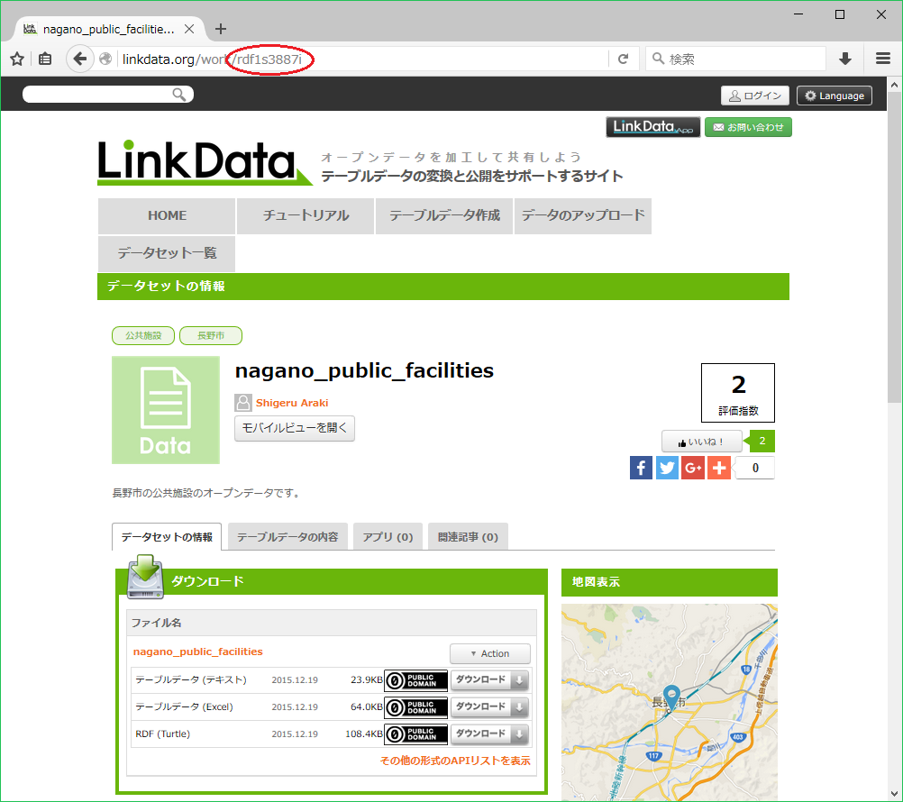 データセットのIDは、LinkData.orgでデータセットの情報を表示したときのURLの「http://linkdata.org/work/」につづく「rdf」で始まる文字列です。