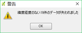 ファイルによっては、緯度経度のプロパティを持ちながら、その値を持たないレコードが含まれていることがあります。その場合には以下のような警告が表示されます。