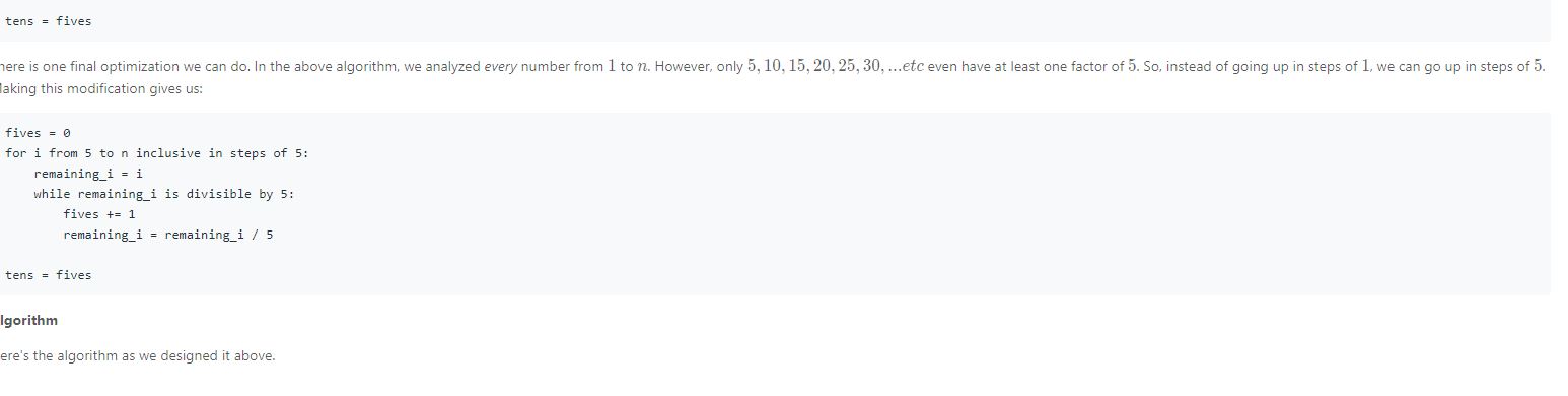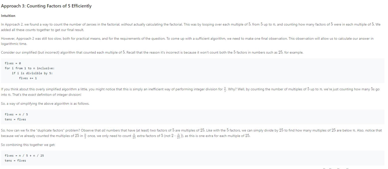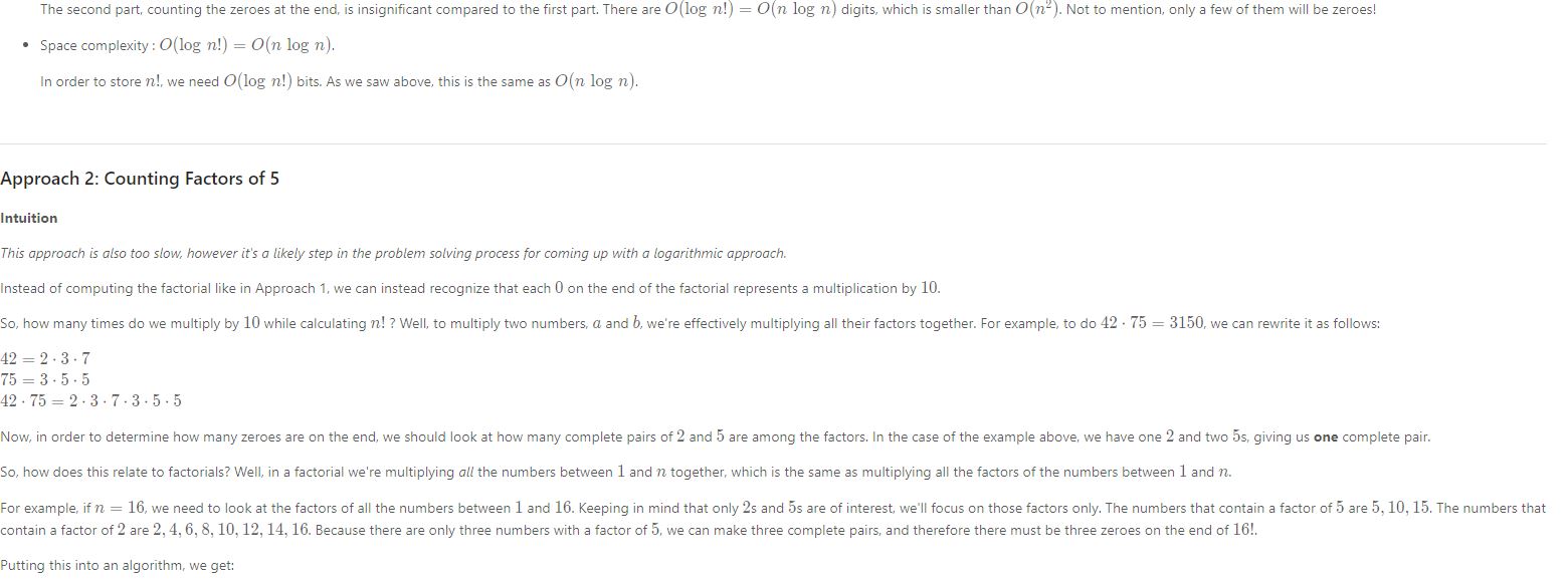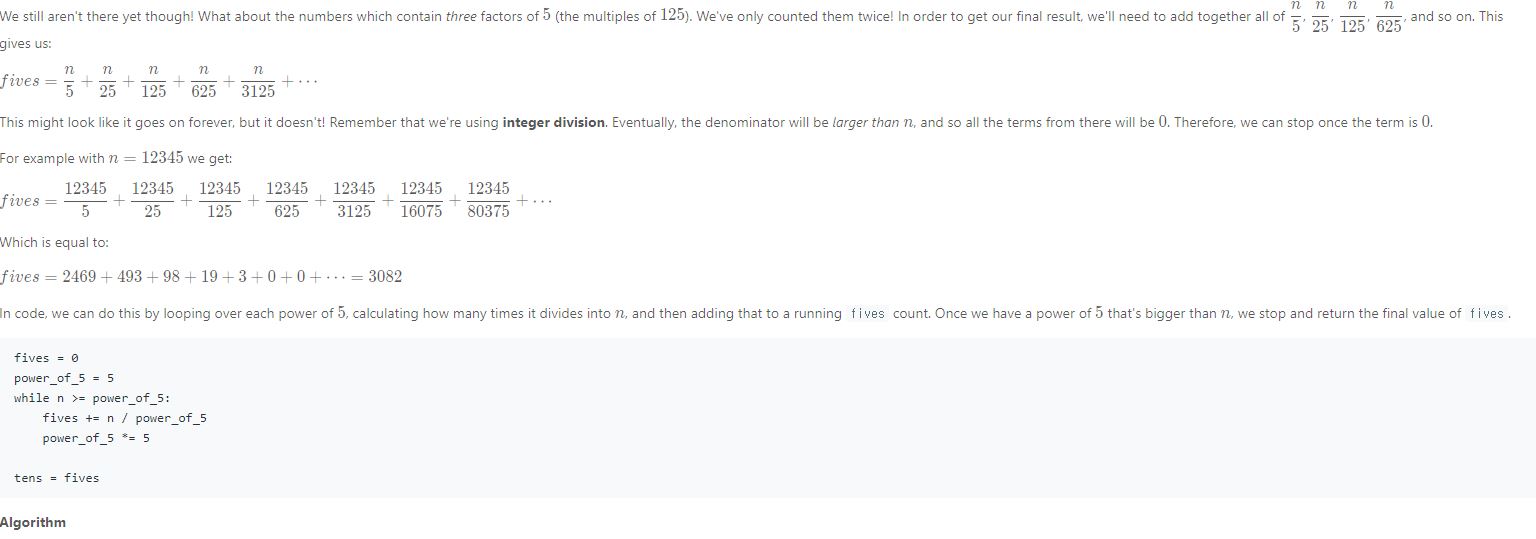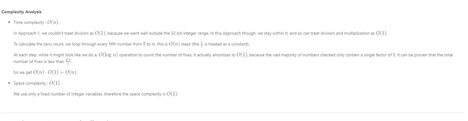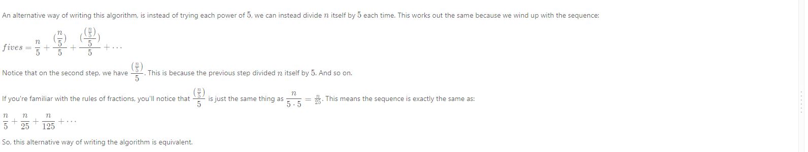 In this approach, we divide nn by each power of 55. By definition, there are \log_5nlog 5 n powers of 55 less-than-or-equal-to nn. Because the multiplications and divisions are within the 32-bit integer range, we treat these calculations as O(1)O(1). Therefore, we are doing \log_5 n \cdot O(1) = \log , nlog 5 n⋅O(1)=logn operations (keeping in mind that \loglog bases are insignificant in big-oh notation).