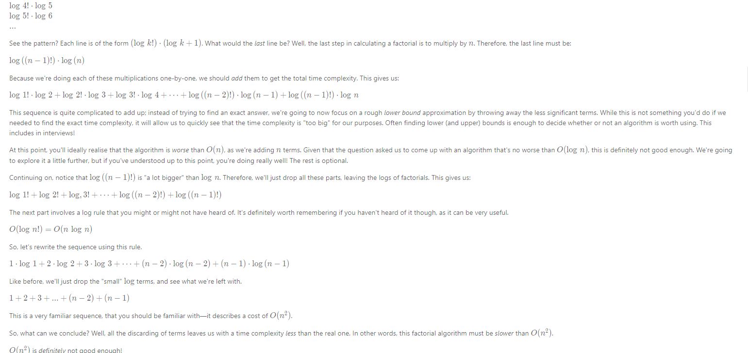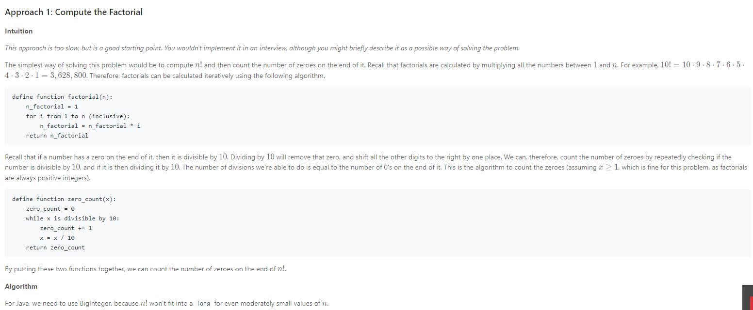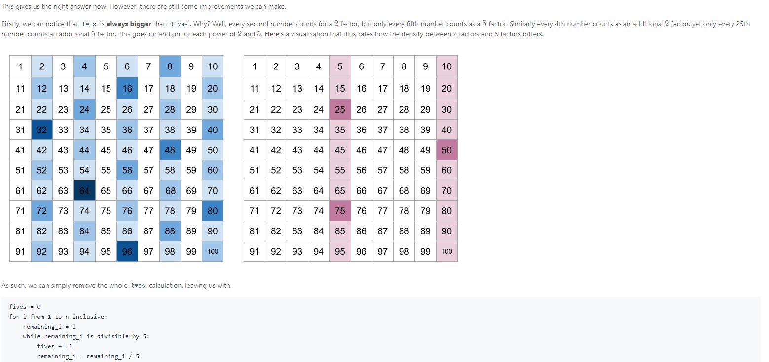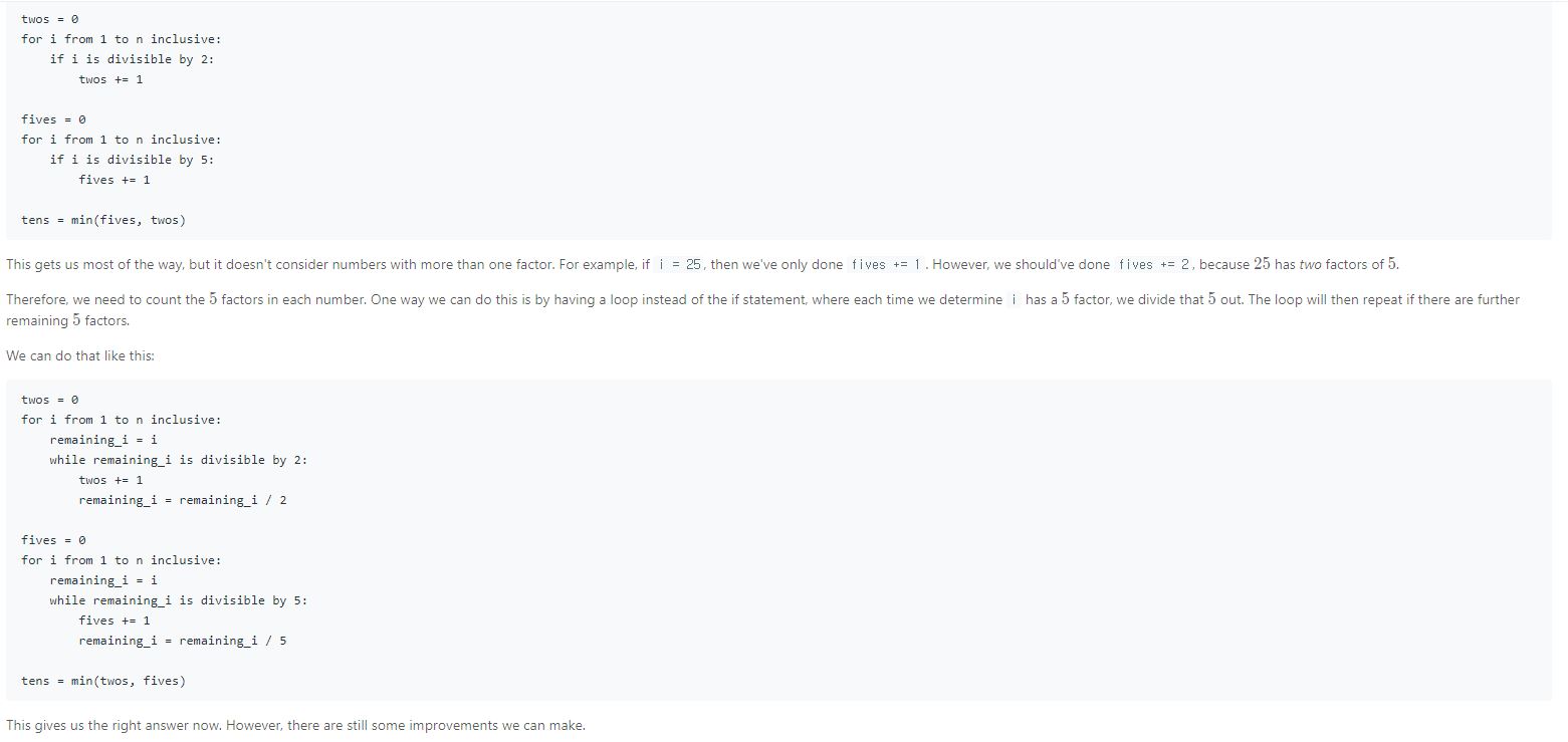 In this approach, we divide nn by each power of 55. By definition, there are \log_5nlog 5 n powers of 55 less-than-or-equal-to nn. Because the multiplications and divisions are within the 32-bit integer range, we treat these calculations as O(1)O(1). Therefore, we are doing \log_5 n \cdot O(1) = \log , nlog 5 n⋅O(1)=logn operations (keeping in mind that \loglog bases are insignificant in big-oh notation).