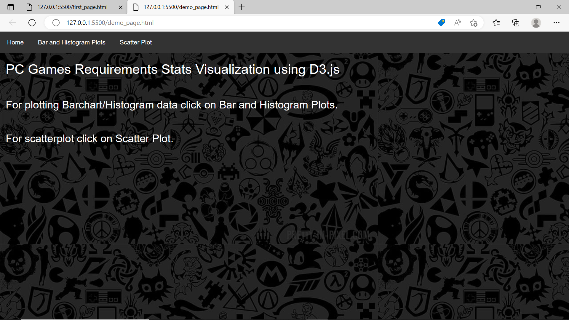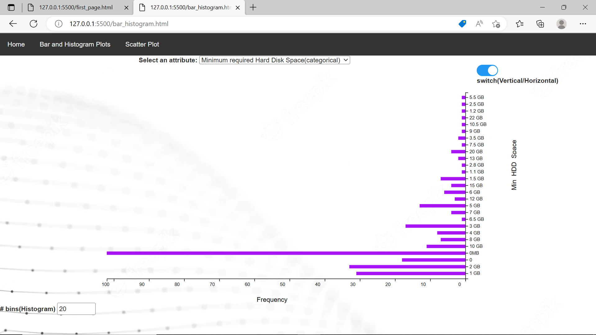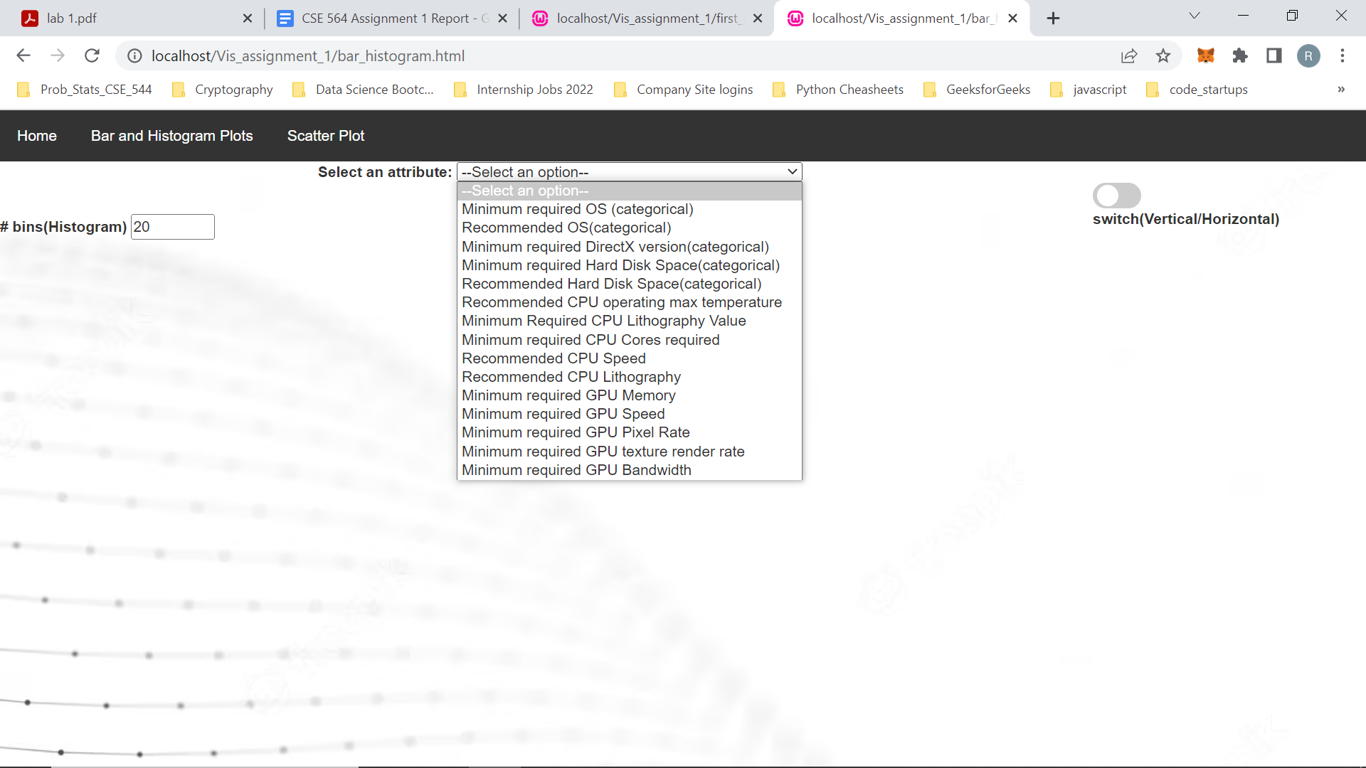 The screenshot above shows that on selecting the link "Bar and Histogram Plots" or "ScatterPlot", the webpage containing the dropdown menu implemented for the visual interface isdisplayed, whereas the switch is only available for the bar chart.