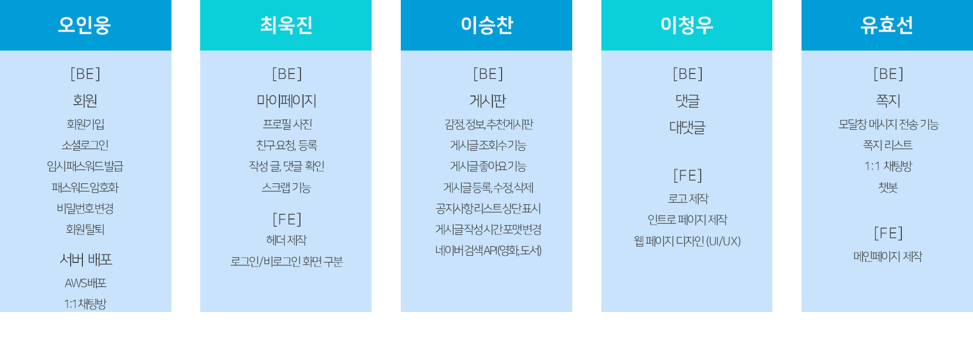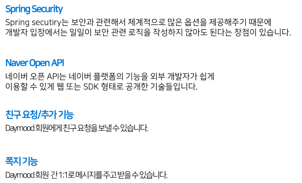 daymood 프로젝트 개요 기술 스택 테이블 구조 사이트 구조 역할 분담 주요기능 시연영상 https://www.youtube.com/watch?v=xTI4YUJ5XtE&t=8s 인원 구성 팀장: 오인웅, 수석 프로그래머: 최욱진, 팀원: 유효선, 팀원: 이청우, 팀원: 이승찬