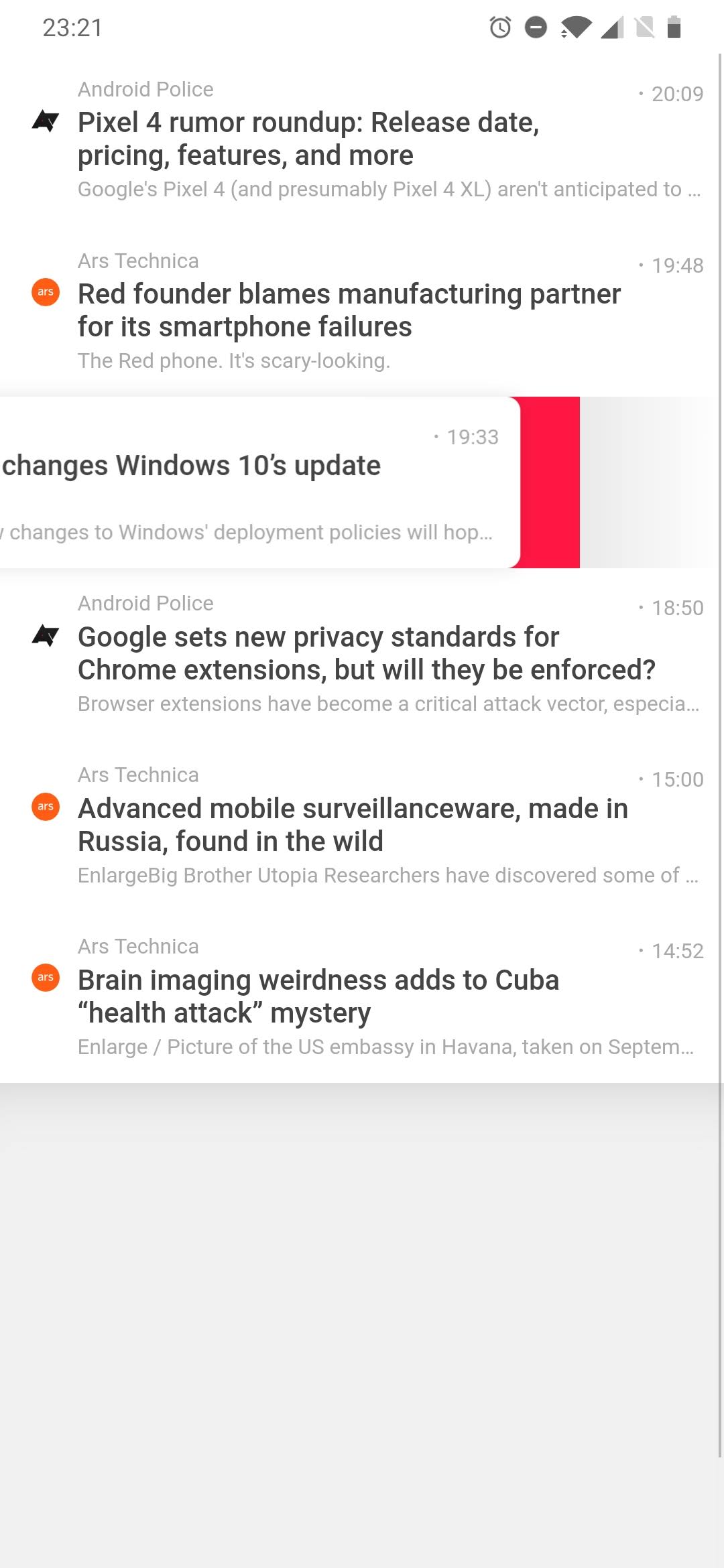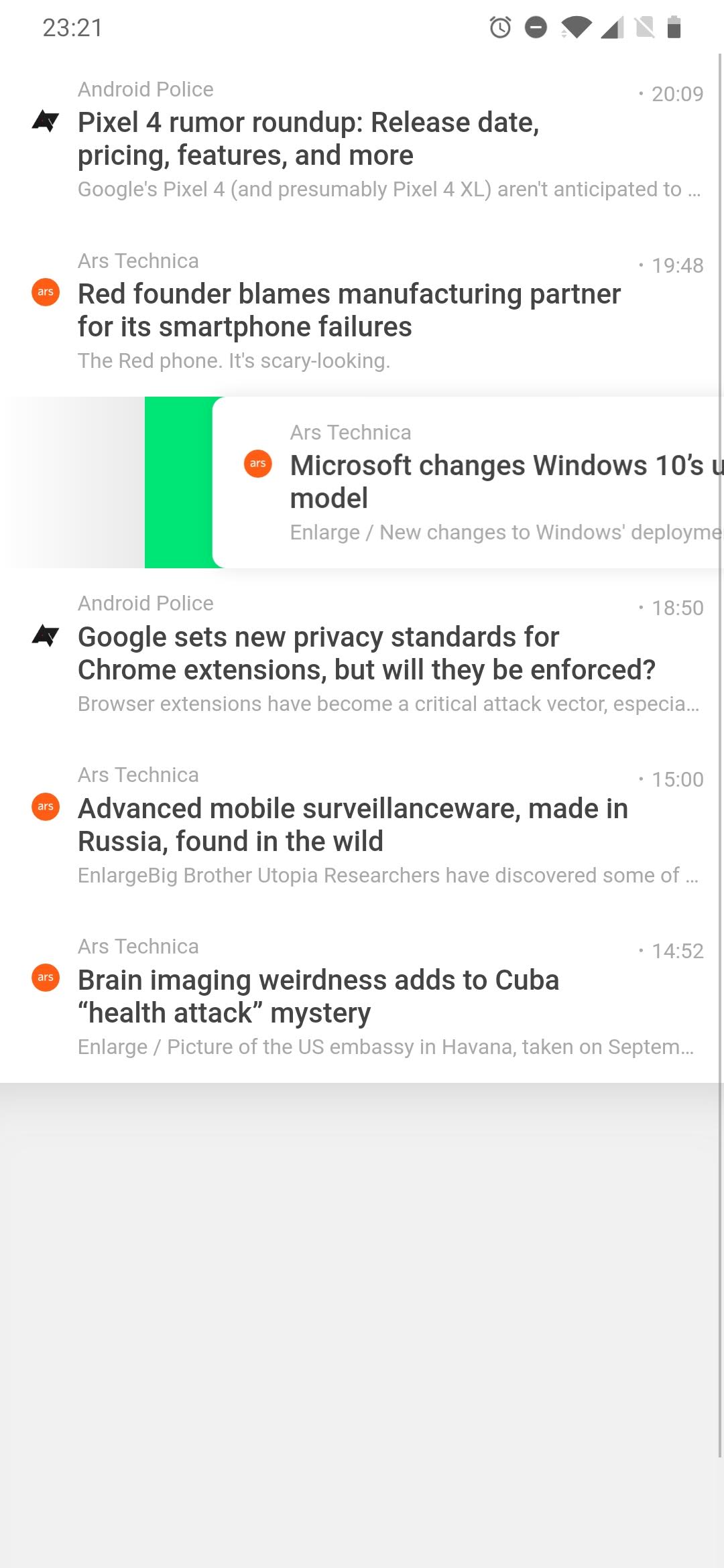 - Swipe article in the list: Green - go to url of the article; Red - mark article as read and remove from the list.