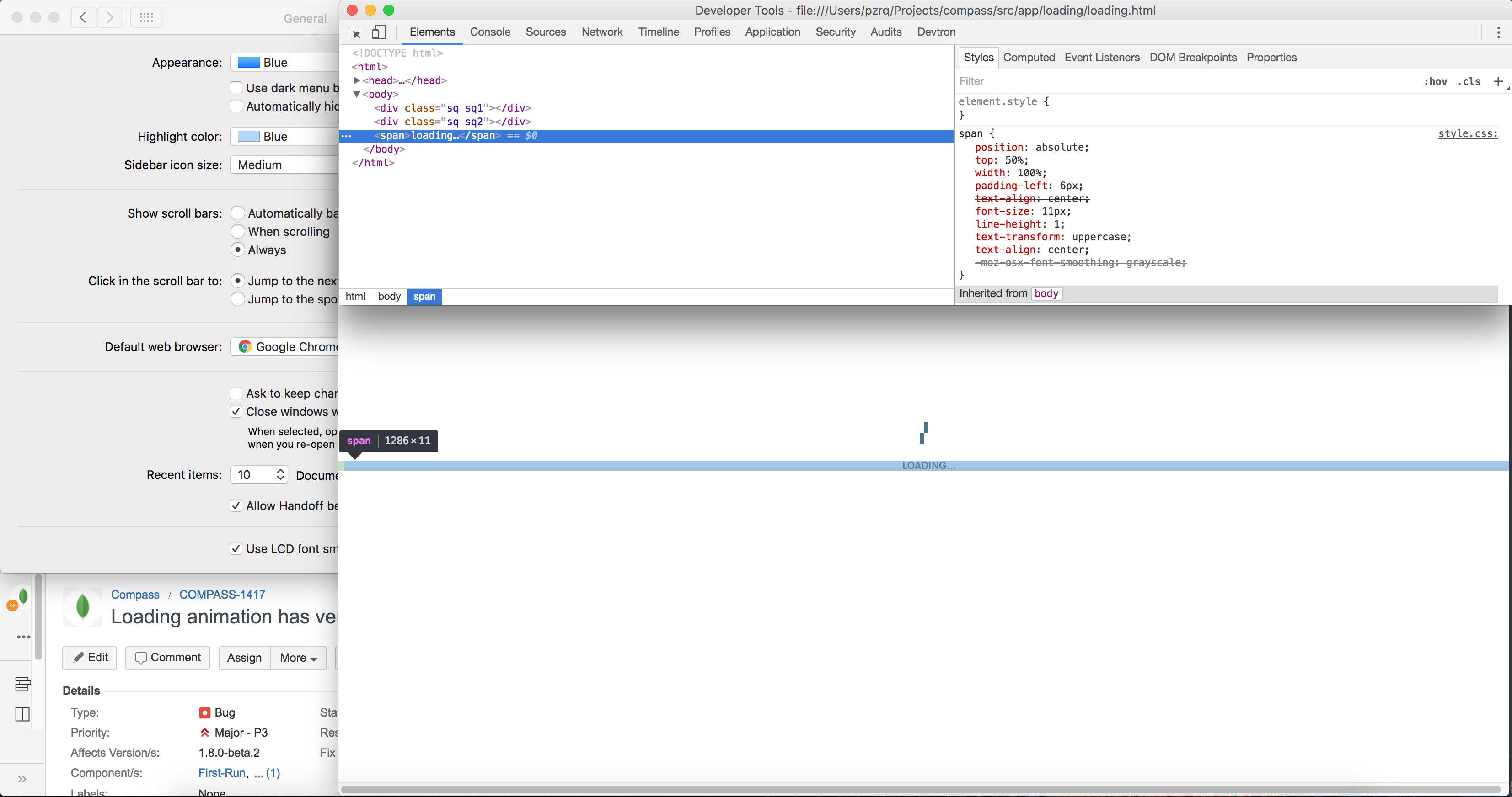 … (#1204) * Temporarily disable hiding the loading animation So it's easier to inspect its state. * Remove default 8px margin * Use standard top/left pattern from .sq CSS class * Go back to width: 100% removing margin/padding No flexbox needed in this context. * Remove duplicate text-align * Abstract towards a reusable loading animation component CSS animation appears to be special enough I don't know how to handle it in this context, perhaps it needs another wrapper? * Revert "Temporarily disable hiding the loading animation"