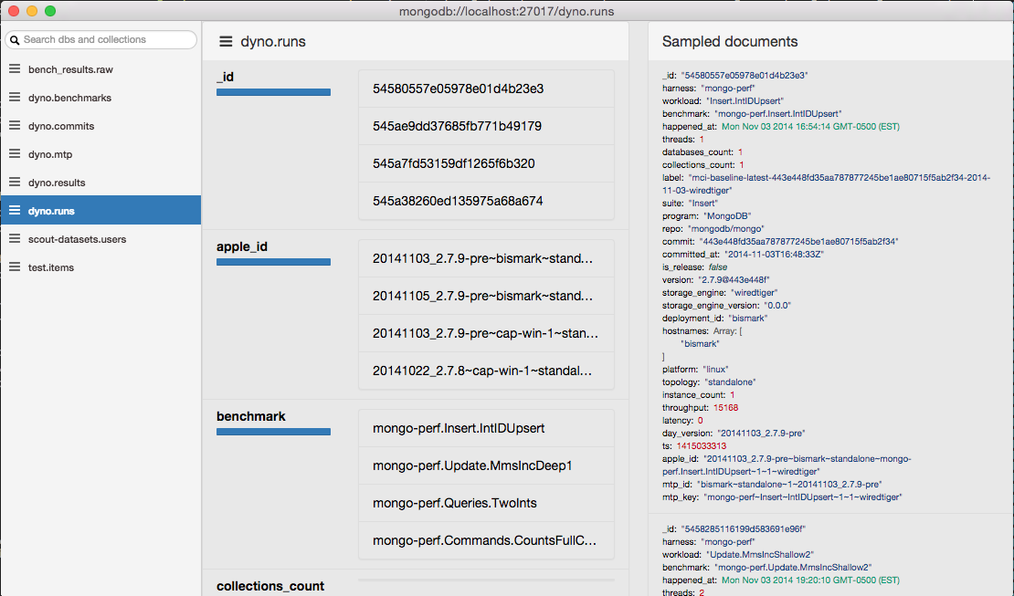 ' +}); + +var DocumentListView = AmpersandView.extend({ + template: '', + render: function() { + this.renderWithTemplate(); + this.renderCollection(this.collection, DocumentListItemView, this.queryByHook('documents')); + } +}); + +var CollectionView = AmpersandView.extend({ + bindings: { + 'model._id': { + hook: 'name' + } + }, + children: { + model: models.Collection, + schema: require('../models/sampled-schema') + }, + initialize: function() { + app.statusbar.watch(this, this.schema); + + this.schema.ns = this.model._id; + this.schema.fetch(); + }, + template: require('./collection.jade'), + subviews: { + documents: { + waitFor: 'schema.documents', + hook: 'documents-container', + prepareView: function(el) { + return new DocumentListView({ + el: el, + parent: this, + collection: this.schema.documents + }); + } + }, + fields: { + waitFor: 'schema.fields', + hook: 'fields-container', + prepareView: function(el) { + return new FieldListView({ + el: el, + parent: this, + collection: this.schema.fields + }); + } + } + } +}); +``` + +Finally, modify the template `scout/scout-ui/src/home/index.jade` +to position our new subview. + +```jade +// scout/scout-ui/src/home/index.jade +.panel-group + .contextbar(style='width: 400px;position: absolute; right: 0;') + .panel.panel-default + .panel-heading + .panel-title Sampled documents + div(data-hook='documents-container') + + .panel.panel-default(style='margin-right: 420px;') + .panel-heading + .panel-title + i.fa.fa-fw.fa-bars + span(data-hook='name') + div(data-hook='fields-container') + .clearfix +``` + +Start up scout with `cd ~/scout && npm start` and you should see your +new panel that looks something like the below: + +