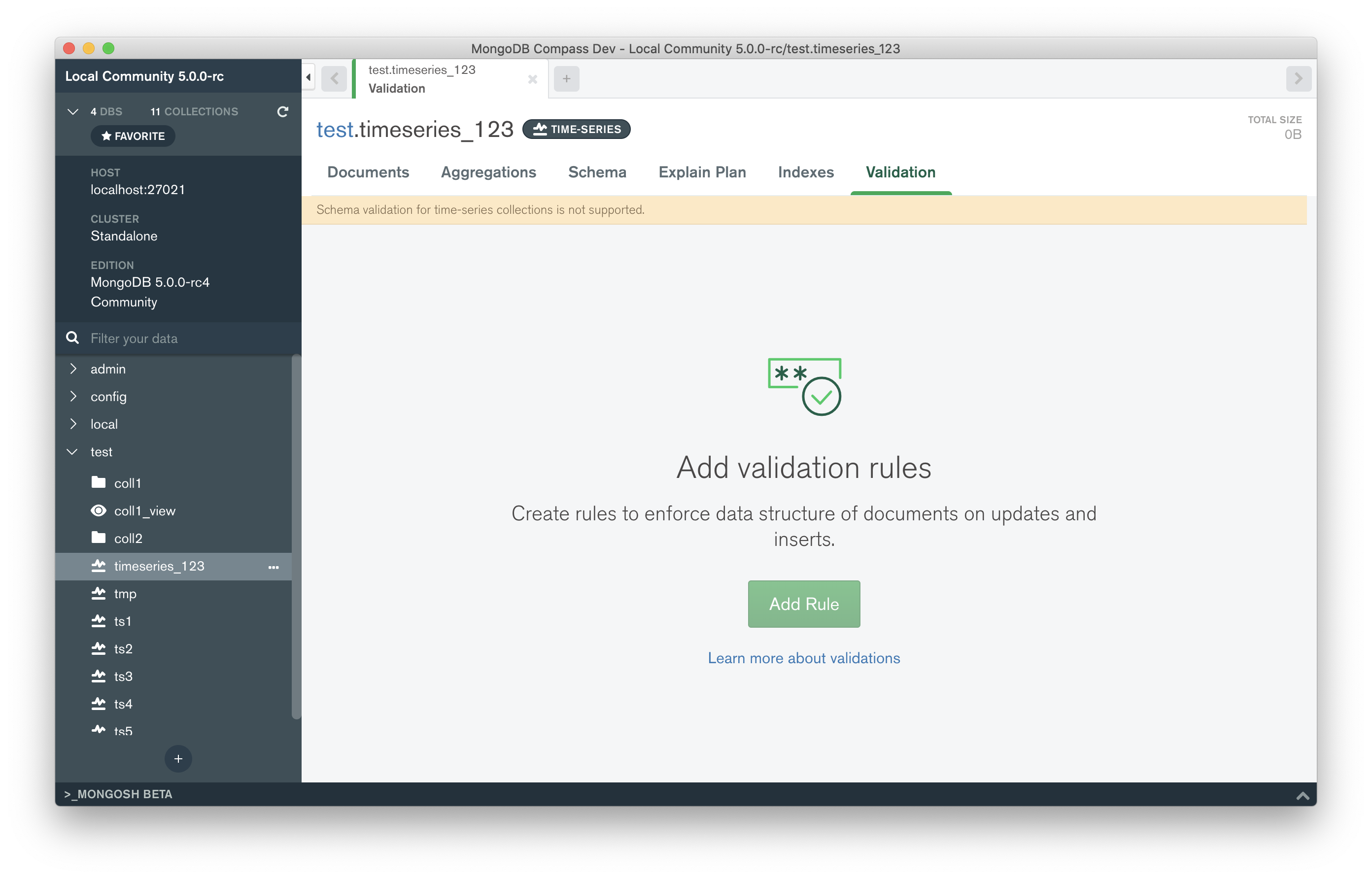 Custom validation can not be added to time-series collection, this PR disables validation tab interactions and adds a warning message at the top of the subtab