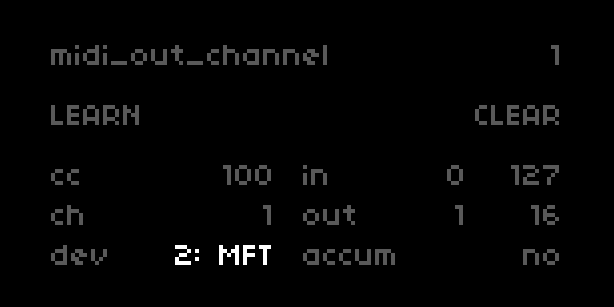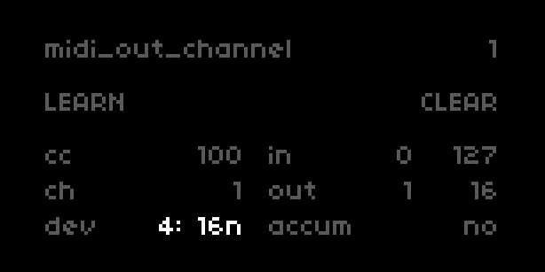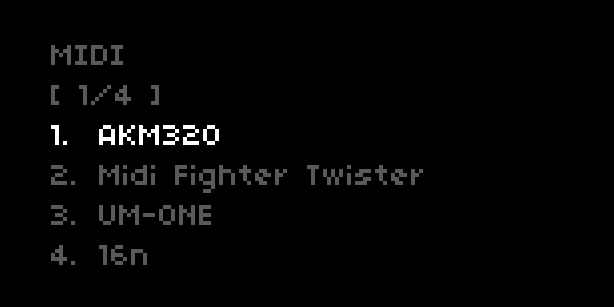 this is great! some minor inline comments to address but tested it out, nice attention to detail. one big change i'd like you to tackle first, however, is you introduce a new scrolling/paging style for the device midi menu. i'd much prefer you make it conform the the existing style which is followed by the SELECT and PARAM lists: basically six lines displayed, highlight on line 3. for device/midi the minor mod to this would be MIDI on line 1, line 2 blank, then have lines 3-6 scrolling while keeping line 3 the highlight. awesome work! |