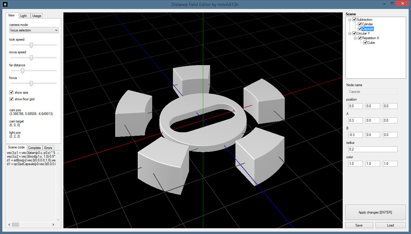 - PLEASE NOTE: Scene files created with earlier versions won't load because SDF function definitions have changed! The scene file format itself has not changed.