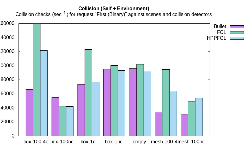 Just for completeness: hpp fcl does offer a newer api for collision checks and this might speed up things in fact. Also hpp fcl might be faster at the narrow phase, especially mesh to mesh, which my benchmarks do not test that well. I still hope to finish the MoveIt 1 PR and then this could be ported |