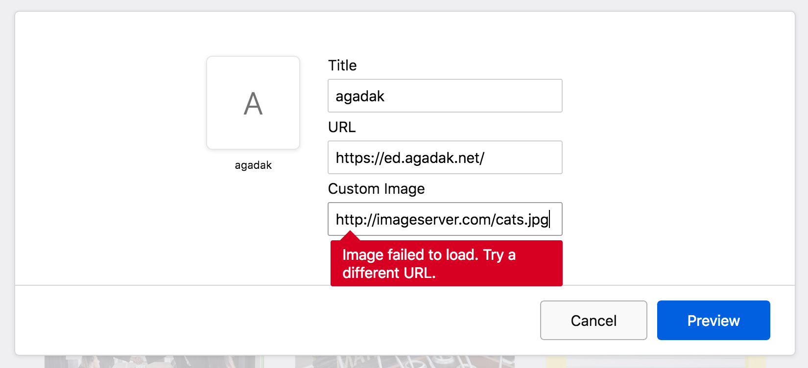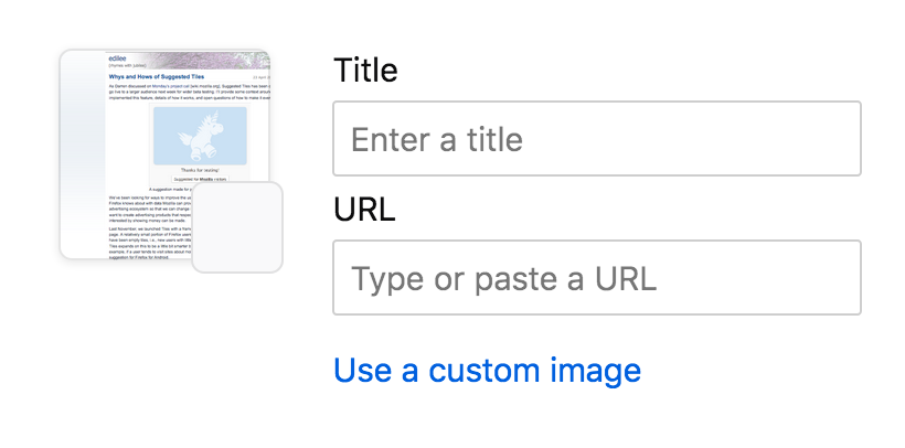 @aaronrbenson What's the expected behavior for various interactions and does this current PR look correct? This used to have the page's screenshot, but when the image failed, it switched to just the letter fallback. The change to letter could be useful as an extra indication that it attempted. Also, is the failure message text and sizing correct -- I don't see that message in the invision doc: The preview link should not be interact-able and should have the image cropped differently? (Currently you can click it, and it navigates.) This shows up when deleting the content of the input box: I guess we shouldn't show the old screenshot when the url is cleared? Also, the sizing of the text and the string for the custom image should have ellipsis…? Also, what should cause the custom image input to disappear? Right now moving focus away from the image input box when there's no value makes it disappear. Is this the desired layout with the URL red error message? We probably want a non-text-selection cursor for hovering… and the color should be? The size of the confirmation button changes widths when it goes from Preview to Save, but probably not too much we can do there while not causing oddness for l10n? |