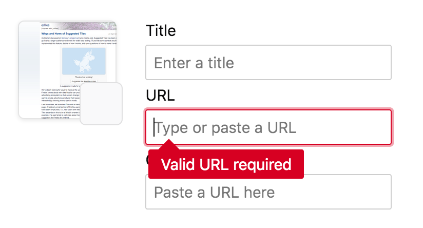 - topsiteUrlValidationError & screenshotUrlValidationError - This way I can notify the TopSiteEditInputs component of validation errors (to show error labels & focus the elements) while at the same time keep the validation methods in the TopSiteForm component where they are needed more (add/save/preview functionality).