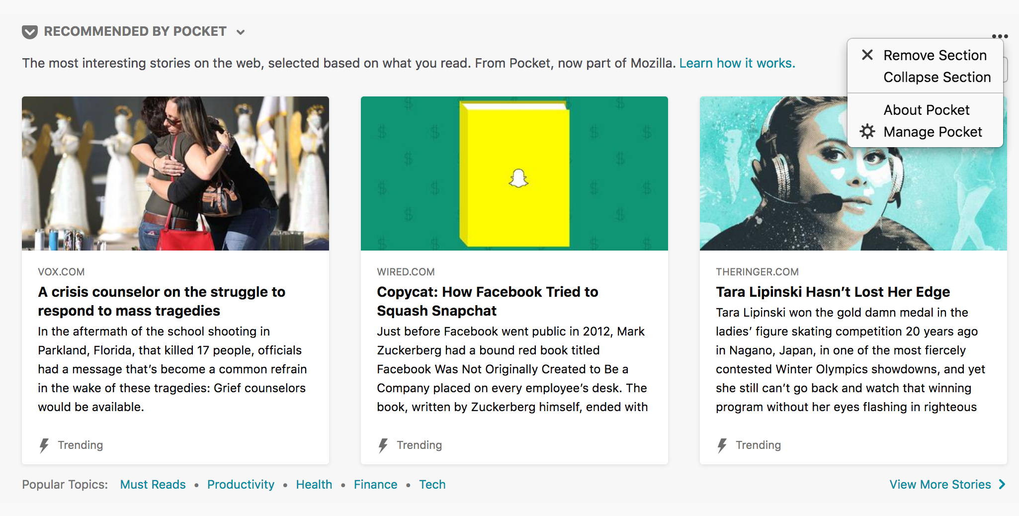 @aaronrbenson @bryanbell Should all the menu options be actions, e.g., "Learn More" vs "About Pocket" and "View Privacy Notice" vs "Privacy Notice"? Also, we don't call the top stories section "Pocket" right now… It's "Recommended by Pocket", so should the menu actions be "Manage Recommended by Pocket"? |