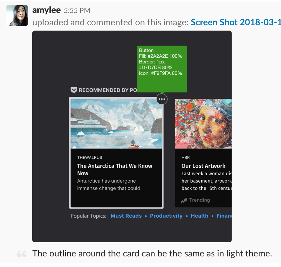 Basically, I went through every color spec'd out in the dark theme spec that needed to be changed and started breaking them out into variables. And then I tried to consolidate into as few variables as possible in some cases I had to get UX (Amy) to nod some changes/compromises to save a variable and keep more generic. But it's possible we can reduce it more? See https://mozilla.invisionapp.com/share/H4FW3RYFXVK#/screens/279681634_New_Tab_Dark_Theme_Spec and: |