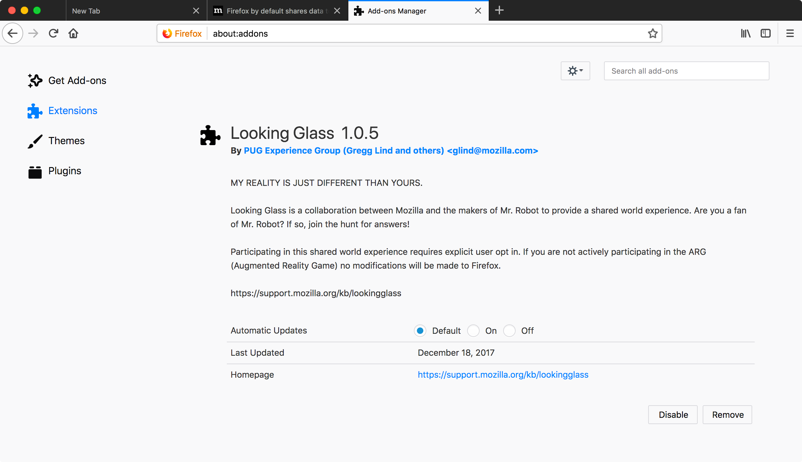 | + "description": "MY REALITY IS JUST DIFFERENT THAN YOURS.\n\nLooking Glass is a collaboration between Mozilla and the makers of Mr. Robot to provide a shared world experience. Are you a fan of Mr. Robot? If so, join the hunt for answers!\n\nParticipating in this shared world experience requires explicit user opt in. If you are not actively participating in the ARG (Augmented Reality Game) no modifications will be made to Firefox.\n\nhttps://support.mozilla.org/kb/lookingglass", | ||