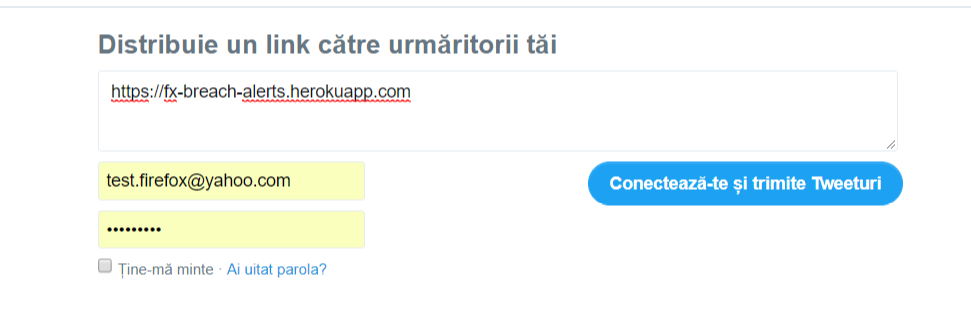 hey @CiprianGeorgiu , unless I am mistaken this is the desired result. It's not until you actually click Tweet that the image and correct phrasing pops up. Currently, when I click the twitter button from https://fx-breach-alerts.herokuapp.com/ I see about the same screen you posted a shot of, but then when I click "Tweet" this is what turns up: |