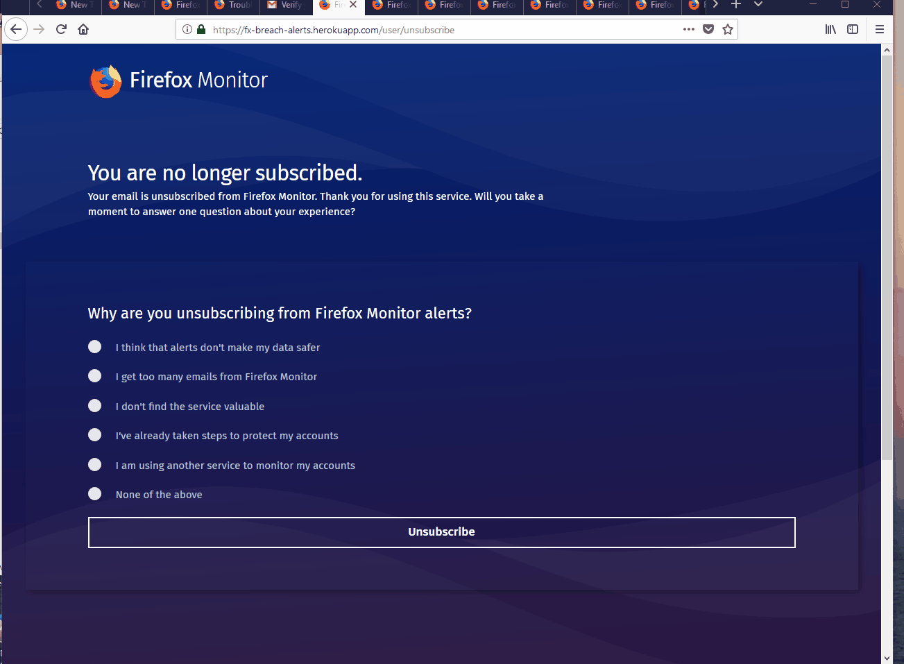 The user is redirected to the Firefox Monitor homepage after refreshing the unsubscribe page #355