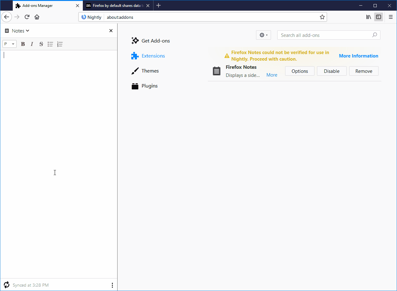- Have a new Firefox profile with the latest "Firefox Notes" add-on version (2.0.0b7) installed.
