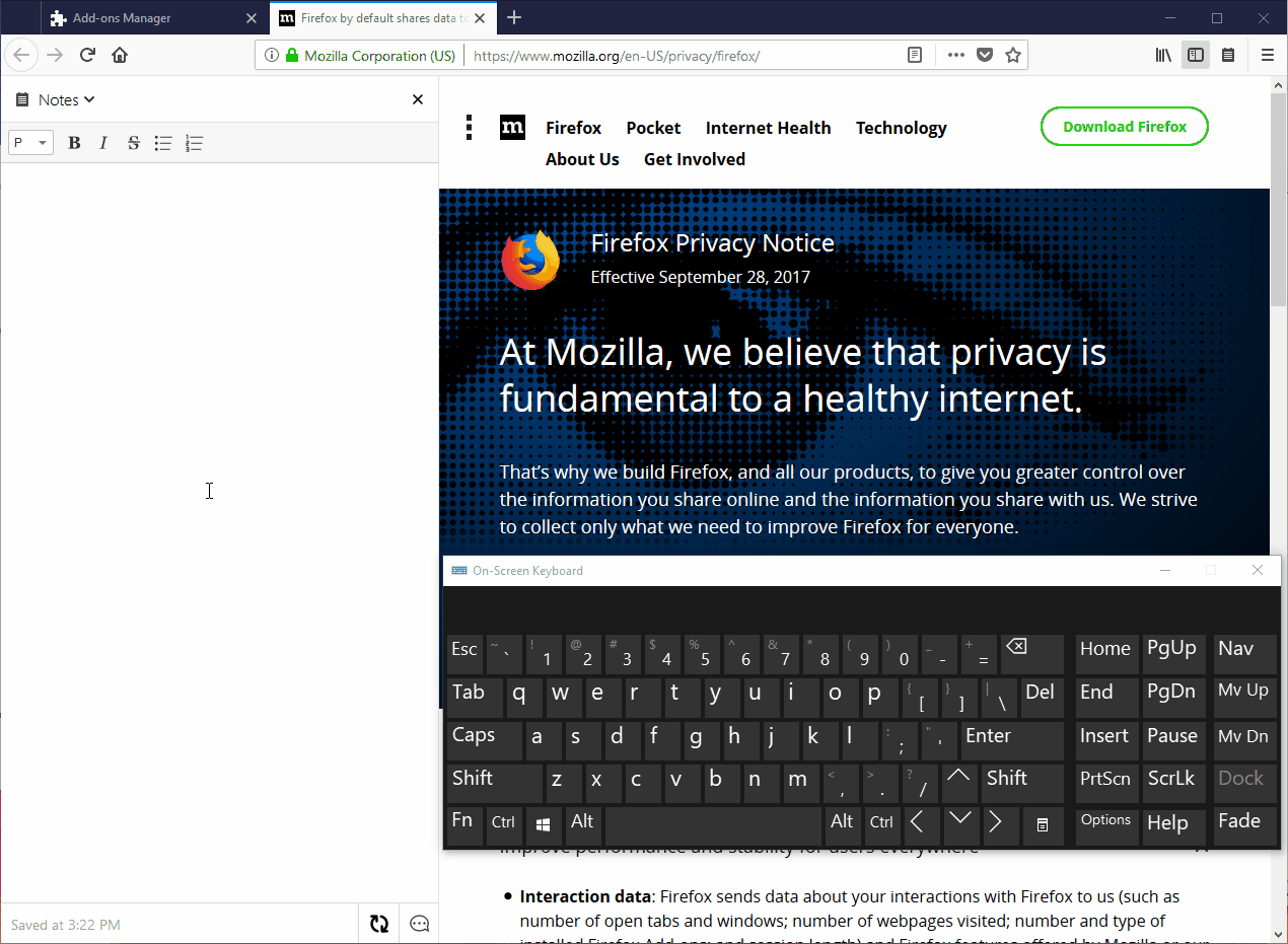 - Have a Firefox profile with the latest version of the "Firefox Notes" add-on (2.2.0dev custom build from 01.17.2018) installed.