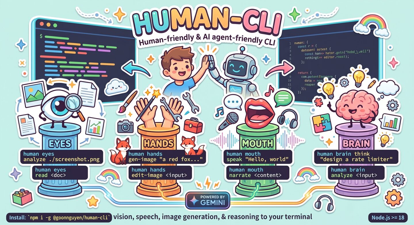 npm i -g @goonnguyen/human-cliRequires Node.js ≥ 18. Heavy/optional deps (playwright, sharp, rmbg, mammoth, xlsx, MCP SDK, etc.) are declared as optionalDependencies — npm installs them if it can, skips silently if your platform doesn't support them.