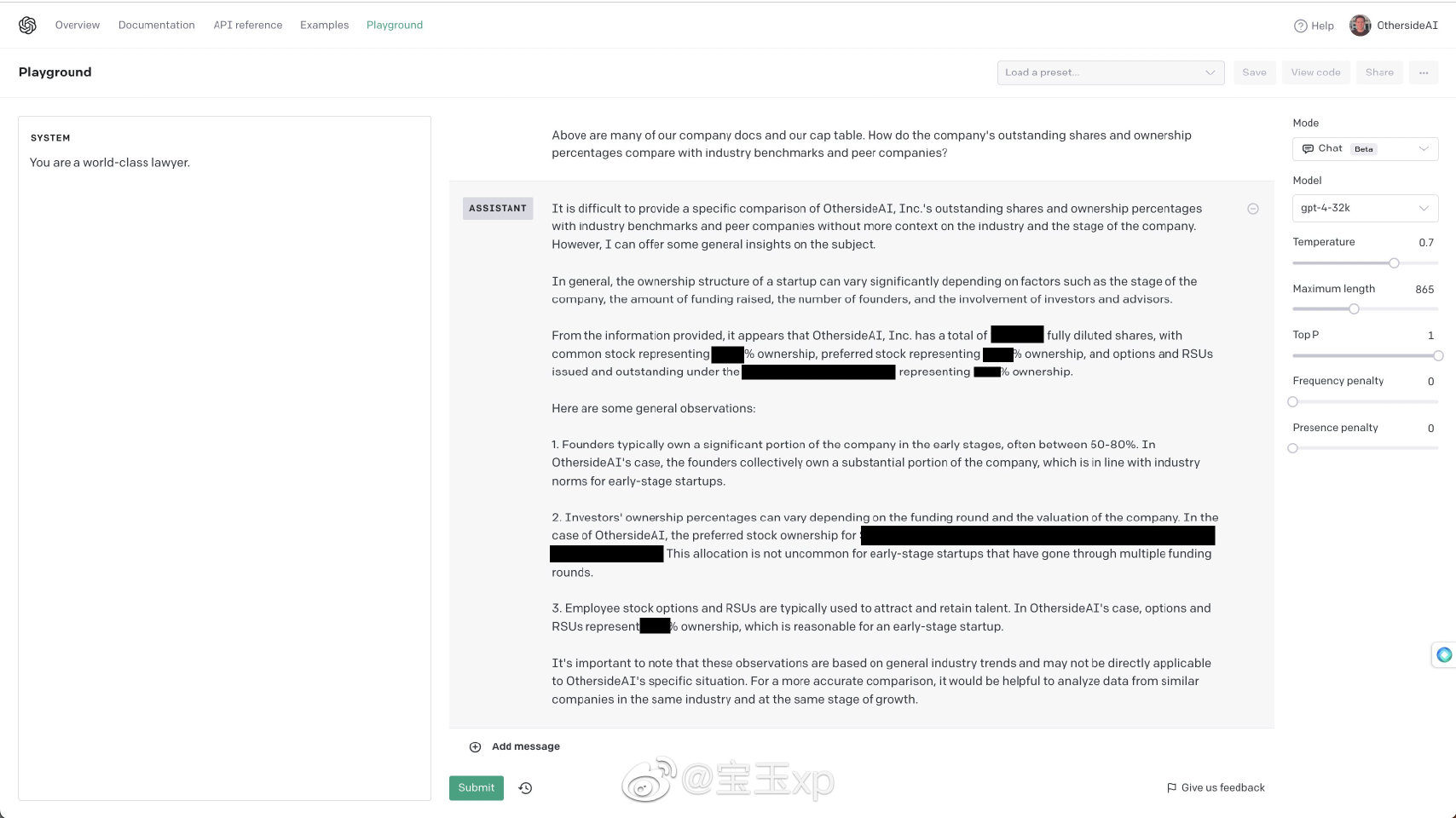 有人测试了GPT-4的32K能力: “GPT-4-32K的能力是惊人的。 在向它提供了几十份公司文件,包括我们的整个资本表后,我向它提出了一些具有挑战性的问题。 它毫不费力地分析了这些数据,并提供了详细、准确的答案,而这通常需要律师的专业知识。” 如果有更长的上下文后,GPT可以做的事更多了。   https://weibo.com/1727858283/MEap7D7Ac