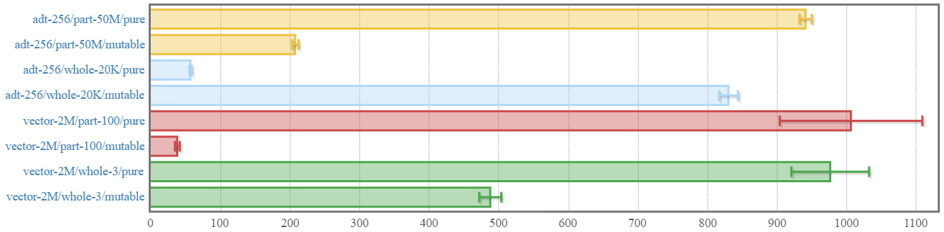 Interestingly, the "update entire structure" case (which should be the worst-case for mutable and the best-case for pure values) actually becomes faster with mutable when you get to the region of many values... somewhere between 256 and 2 million, apparently. However, this may just be from the efficiency of modifying vectors sequentially.