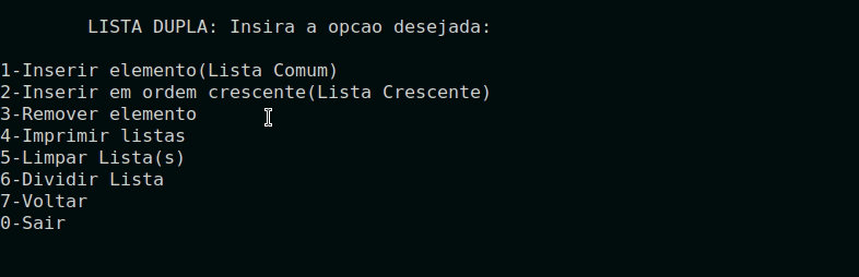 This is a refactored project I developed as a requirement at college. As expected from a C algorithm-only, it's just a black terminal screen showing a bunch numbers and basic instructions. The application features basic manipulations in linked lists, including basic insertion, ascending order insertion, remove element, print list and split list.