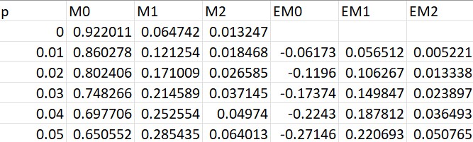 - increment: The increment at which each row on the MIDA table is displayed. For instance, if p is defined as 0.05 and increment as 0.01, then it will display distributions for p= 0, 0.01, 0.02, 0.03, 0.04, 0.05. Must be a factor of p (e.g. p = 0.05 and increment = 0.02 will throw an error because 0.05 % 0.02 != 0).