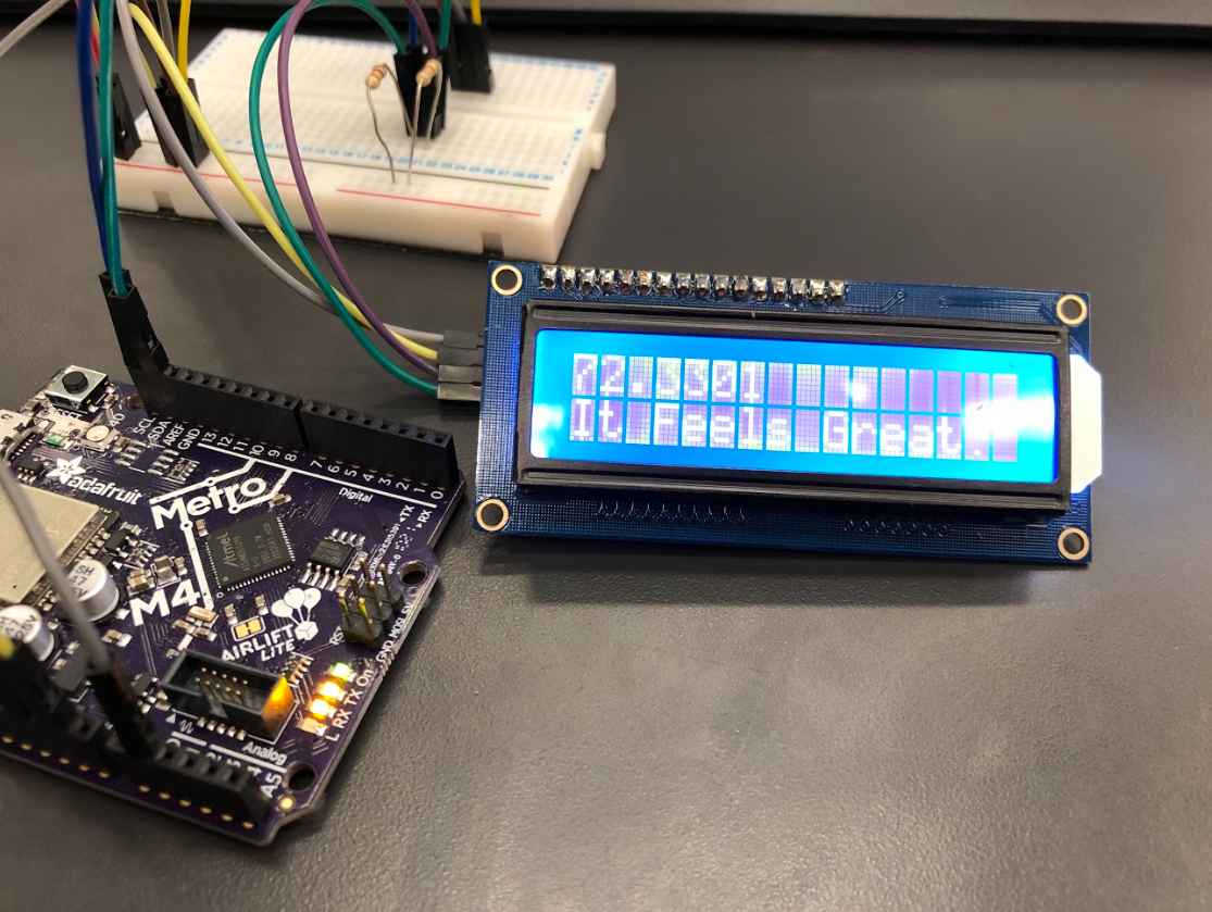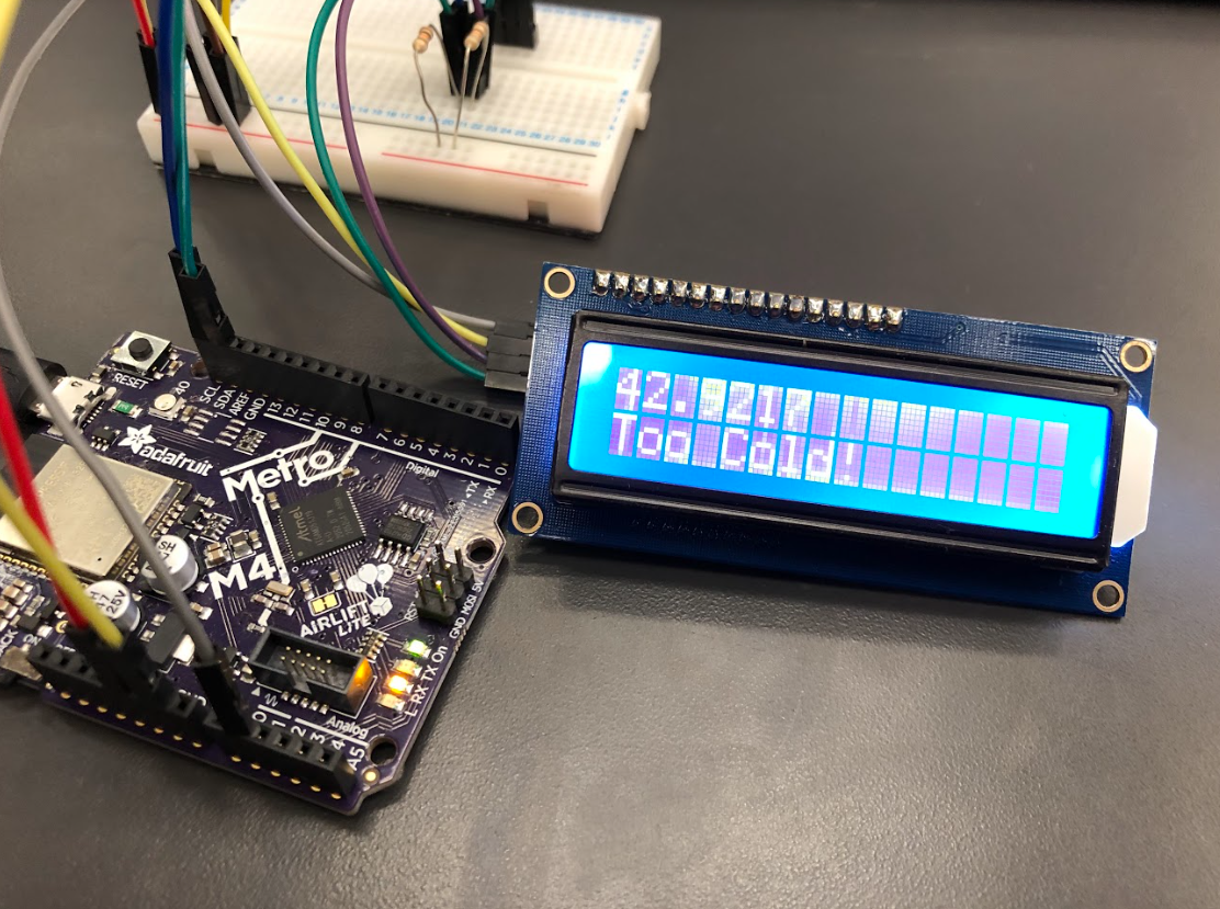 lcd.print("It Feels Great In Here! ") #print it feels great on lcd This assignment wasn't super hard since I was able to take all of my lcd code from a past assignment. The wiring was self explanitory for the exacty same reason as why the code was easy. The main issue I ran into was that my LCD screen didn't print anything I asked it to. The reason was the blue box on the back of the lcd backpack has a scew hole that needed to be turned in order to change the brightness contrast of the LCD so that the screen can actually be seen.