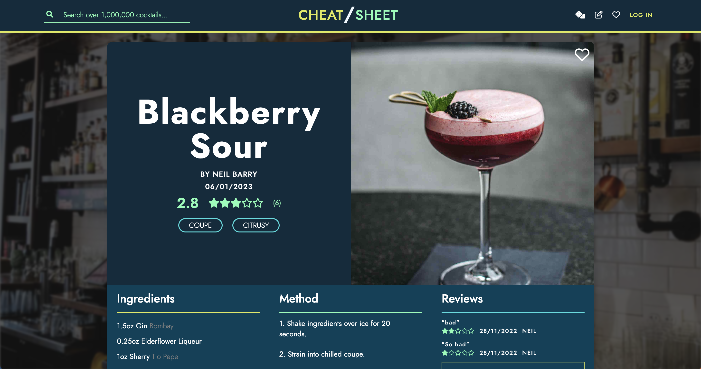 - Search database for cocktails and sort by name, rating etc.
