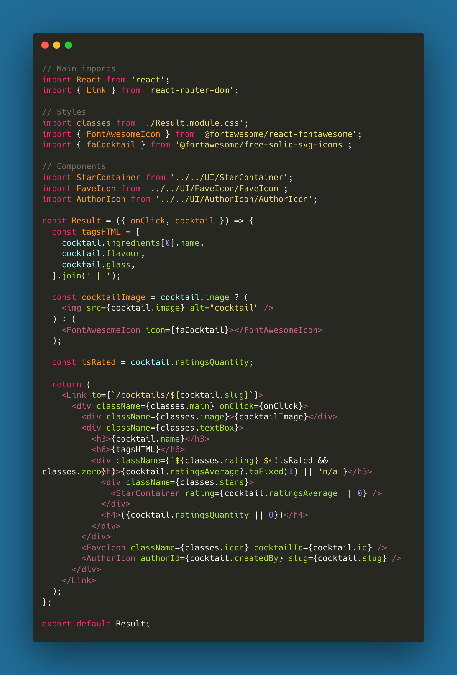 This is a full stack application powered by React, Node, Express and MongoDB that allows authenticated users to create cocktail information cards, and add to a database. Users can query said database for other user’s cocktails and add reviews, ratings and favourites.
