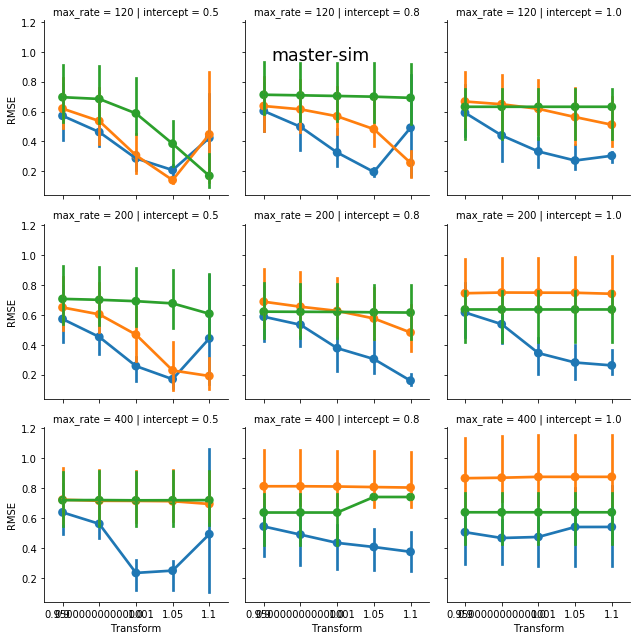 Here's some plots of running the same test, but varying n_neurons, max_rates, and intercepts. First, here's the current performance in master (with `target="sim"):