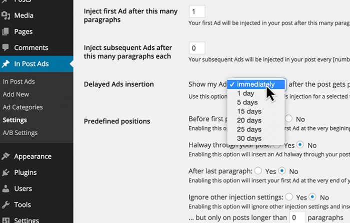 5. Once activated, go to In Post Ads menu to customize the settings.