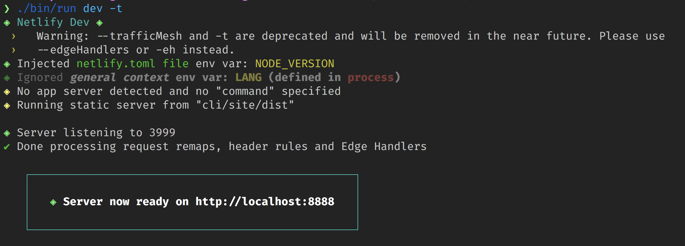 netlify devflag--trafficMesh(short:-t) to--edgeHandlers(short:-eh) and update description toactivates the edge handlers runtime.- A picture of a cute animal (not mandatory but encouraged)