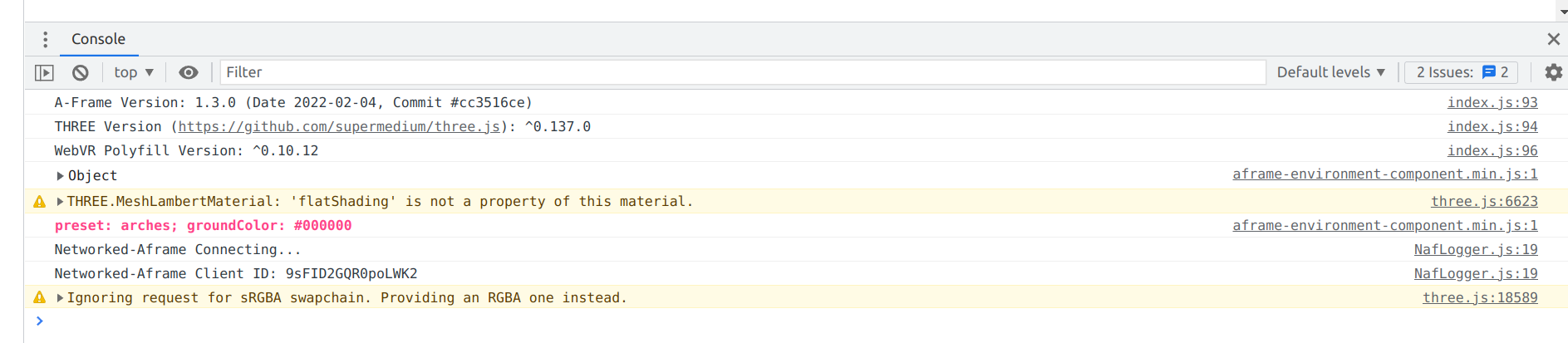 I'm curious about those warnings that were shown on yours. Why are you getting swapchain request/ignore, and flatshading? What OS/browser are you on? That's the only clue I see right now. Next step would be coding up custom demos to chase this down. One might be to just statically display the models in your scene and make sure they can display at all. If that works, then the next thing would be putting breakpoints throughout the init chain of the networked-hand-controls component and seeing what shows up. Maybe duplicating the original demo but only showing one or the other of the hand or controller, to see if removing one allows the other to show up? |