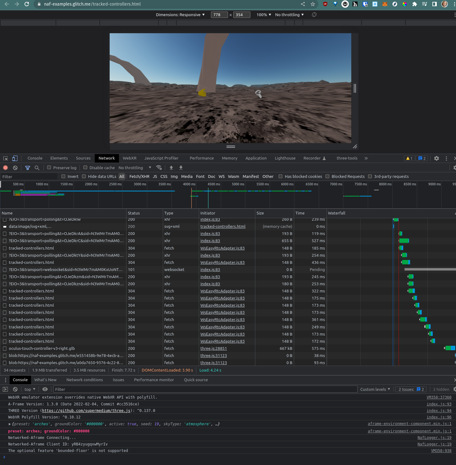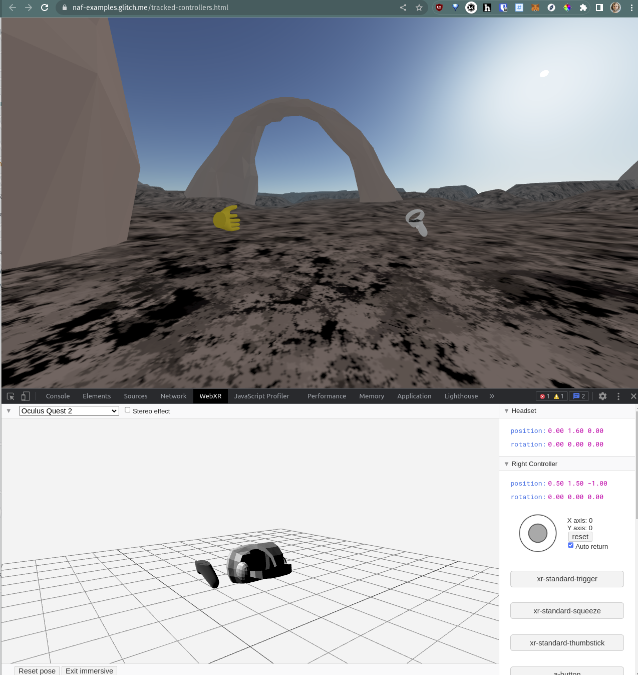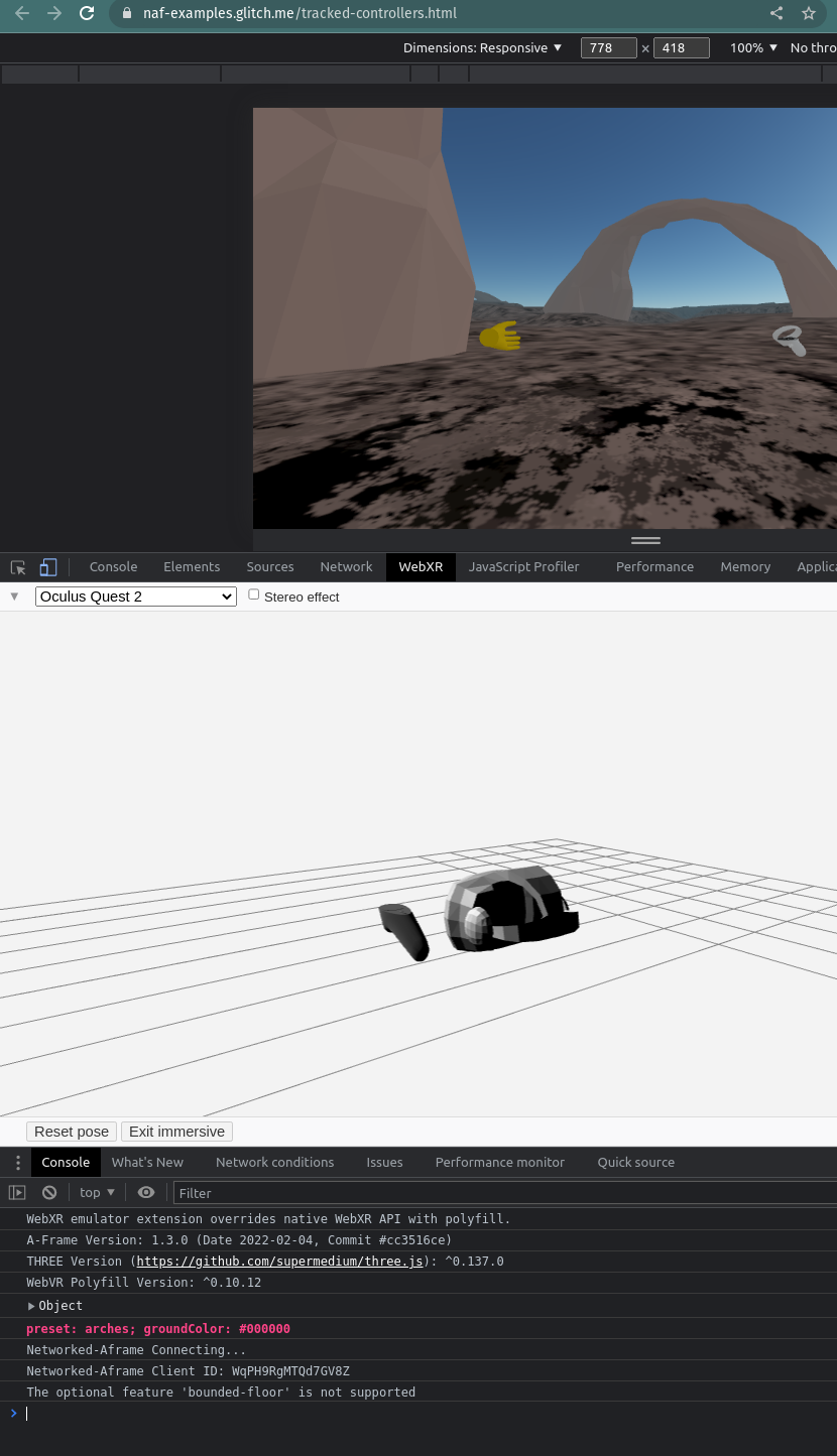 Well that's a mindf*ck... when I visit https://naf-examples.glitch.me/tracked-controllers.html (online obviously) I see someone else (my other computer for tests) but I also see no hands, also not locally in the HMD (even though they are tracked, I can see the OS buttons when I flip them away). Checked via the remote debugging console and spot no error (beside a missing favicon). Edit: just tried another AFrame experience (non networked) relying on |