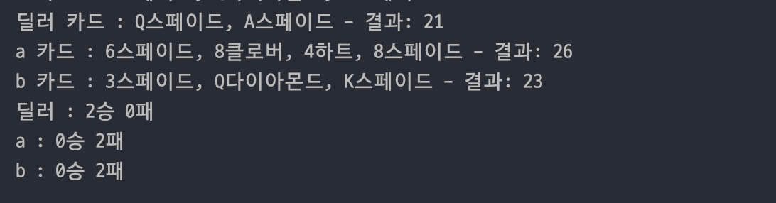 - Player 와 Dealer에게 카드 2장을 배분 프로세스 구현