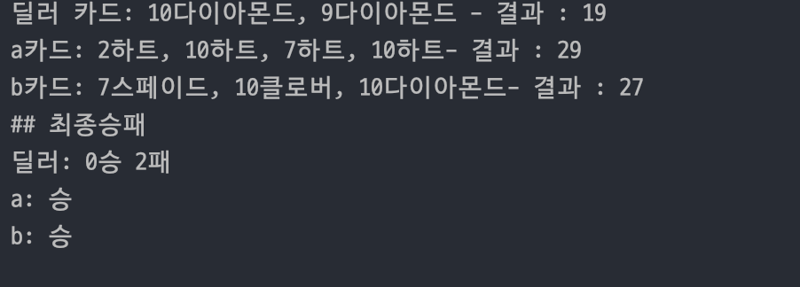 ResultView.printDealerAndPlayerCardResult(dealer.getDealerCards(), players); | ||