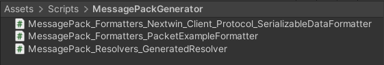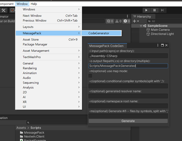유니티 에디터 메뉴의 Window->MessagePack->CodeGenerator를 선택하여 MessagePackCodeGen창을 엽니다.