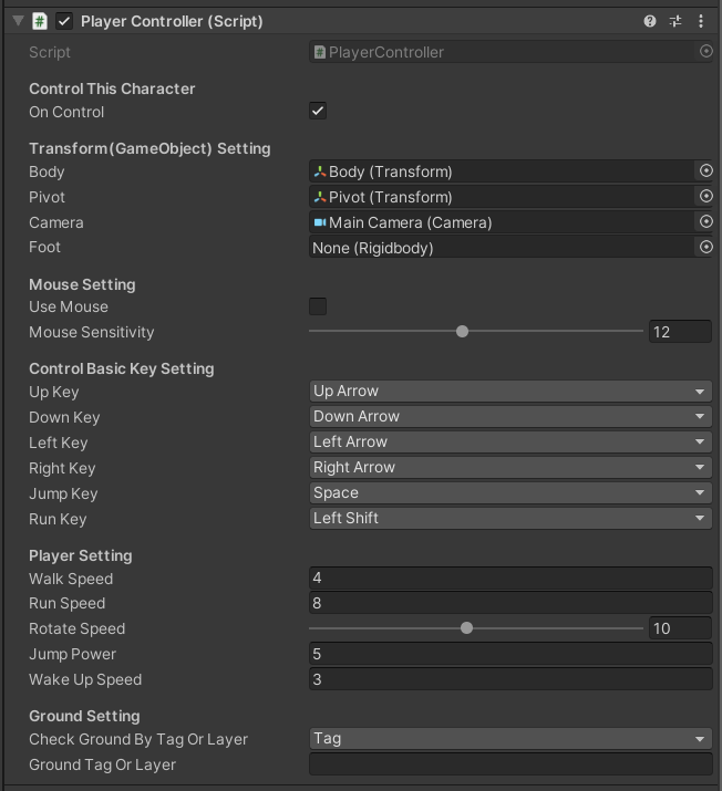 "Use Mouse"는 캐릭터 조작에 마우스를 사용하는지 여부입니다. "Use Mouse" 상태에 따라 게임의 시점과 조작 방법, 그리고 캐릭터의 계층 구조가 달라집니다. "Mouse Sensitivity"는 "Use Mouse"를 체크한 상태일 때만 유효하며 마우스 민감도를 설정하는 항목입니다.