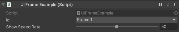 "Id"와 "Show Speed Rate"를 조정할 수 있습니다. "Id"는 UIManager에서 UIFrame을 상속받은 다양한 클래스들을 식별하여 관리할 수 있도록 합니다. UIManagerBase에 전달한 두번째 타입 파라미터이자 UIFrame에 전달한 타입 파라미터, 위의 예제에서는 EFrame에 정의한 멤버 요소들이 표시됩니다. 위의 예제에서는 해당 Frame의 "Id"를 Frame1으로 설정하였습니다. "Show Speed Rate"의 값을 올리면 Frame이 나타나거나 사라질 때 더 빠른 속도로 전환됩니다. 이렇게 두가지 클래스를 정의하고 UI 오브젝트에 Component로 붙이게 되면 아래의 코드를 통해 다음 기능을 구현할 수 있습니다.